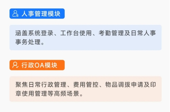 *行政OA模块:聚焦日常行政管理、费用管控、物品调拨申请及印章使用管理等高频场景。