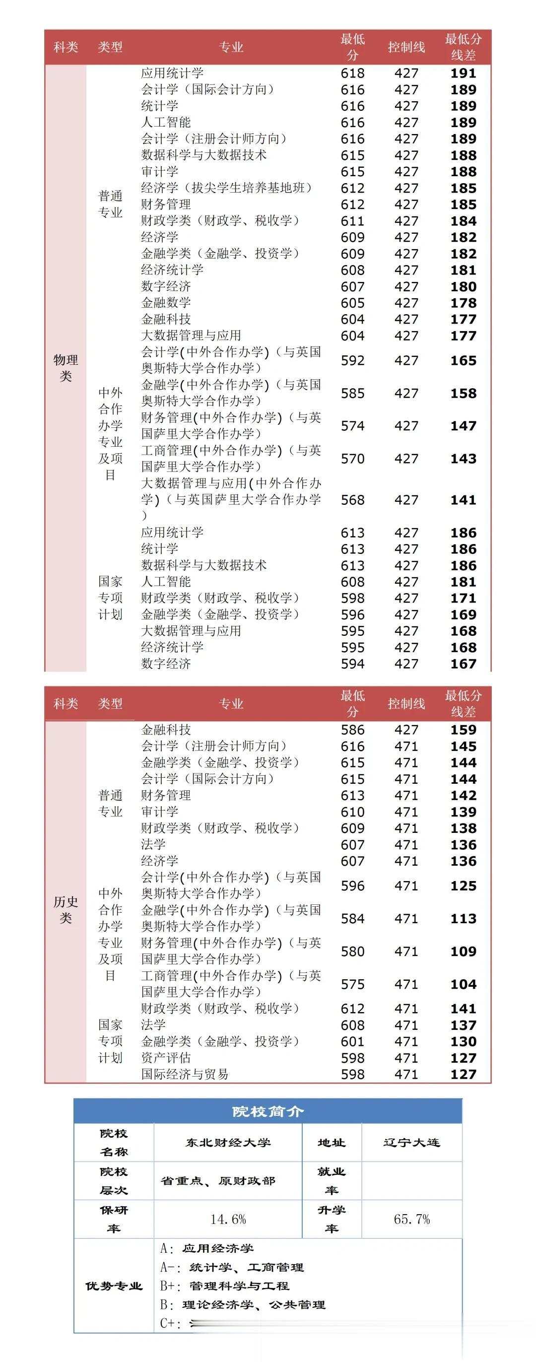 一、物理类考生(省控线 427 分)高分段(预估线差 180+,总分 607+):优先冲普通专业王牌赛道,首推应用统计学(618 分)、会计学(国际 / 注会方向)、统计学、人工智能(均 616 分),这类专业是东财 A/A - 学科核心配套专业,行业认可度顶尖,保研、考研及进入金融、科技大厂核心岗位的优势显著;次选数据科学与大数据技术、审计学(615 分),专业适配当下数字化就业趋势,性价比拉满。中高分段(预估线差 165-180,总分 592-606):重点考虑普通专业中下游优质方向,如金融数学、金融科技、大数据管理与应用(604-605 分),或国家专项计划王牌专业(应用统计学、统计学、数据科学与大数据技术均 613 分),专项计划分数线略低于普通专业,符合河南国家专项报考条件的考生务必抓住,专业实力无差别,能以稍低分数读东财核心专业。中分段(预估线差 141-164,总分 568-591):锁定中外合作办学专业,会计学(中英奥斯特合作,592 分)为首选,金融、大数据管理与应用(中英萨里合作,568-574 分)为次选,毕业证与普通专业无差别,还能享国际课程、双学位福利,会计学专业还可免考 9 门 ACCA,适合想读财经名校、分数稍弱且能接受中外合作学费的考生。二、历史类考生(省控线 471 分)高分段(预估线差 140+,总分 611+):主攻普通专业顶流专业,会计学(注会方向,616 分)、金融学类、会计学(国际方向,均 615 分)为核心选择,是东财文科财经专业的第一梯队,就业对口四大会计师事务所、国有银行、券商等优质平台,专业资源倾斜最多;次选财务管理(613 分),适配想走财会职业路线的考生。中高分段(预估线差 136-139,总分 607-610):优先选审计学(610 分)、财政学类(609 分),或国家专项计划优质专业(财政学类 612 分、法学 608 分),专项计划的财政学类分数线反超部分普通专业,专业实力硬核,符合报考条件的考生可优先考虑;法学专业(607 分)为东财特色,主打财经法务融合,是文科生跨财经 + 法律的优质选择,就业适配企业法务、金融合规岗位。中分段(预估线差 104-135,总分 575-606):重点报考中外合作办学专业,会计学(中英奥斯特合作,596 分)为首选,金融学、财务管理、工商管理(中英合作,575-584 分)为次选,以中等分数拿下东财学历,毕业证无中外合作标注,还能获得国际学位,后续出国深造或国内就业均有优势,是文科生低分冲财经名校的绝佳路径。三、通用报考核心提醒学费与性价比:普通专业学费仅 5720 元 / 年,性价比极高,适合大部分家庭;中外合作办学学费稍高,但配套国际课程、留学指导、证书免考等福利,长期升学就业价值可观,报考前结合家庭经济情况规划。专业与就业匹配:东财的核心优势在财经、财会、统计类专业,报考时优先选择这些方向,行业认可度远高于非特色专业;法学、工商管理等专业需结合自身兴趣,其特色均为 “财经 + 专业” 融合,适配财经领域相关岗位。证书与升学加持:东财财经类专业对接 ACCA、CPA 等主流证书,部分中外合作专业有免考政策,入学后可提前规划考证;院校保研率 14.6%、升学率 65.7%,王牌专业保研名额更多,想升学的考生优先冲核心专业。报考批次选择:符合河南国家专项计划的考生,建议提前填报专项批次,东财专项专业均为优质方向,分数线多低于普通批次同专业,能提高录取概率,普通批次作为兜底。在高考志愿填报中,盲目追求 “头衔” 不如聚焦 “专业实力”,东北财经大学就是这样一所用专业说话的院校。2025 年在河南的招生分数线清晰,报考路径多元,不管是高分冲王牌,还是稳妥选优质专业,都能找到适合自己的方向。