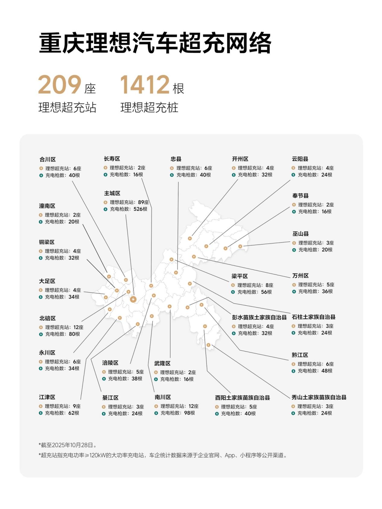 得益于高质量建设和科学布局理念,理想超充站有“数量多、速度快、体验好”优势。截至目前,上线3463座超充站、19161根超充桩,布局31个省份、272个城市,高速超充站超1000座,“九纵九横”高速核心路段平均每148公里有一座。今年平均每天新增4座,未来将持续探索充电形态和能源利用方式。重庆率先成为突破200座的城市,得益于“建设便捷超充之城”的政策效应和合作伙伴支持。200座不仅是数字,更是理想汽车对重庆车主及理想车主承诺的兑现,其“多、快、好、省”正重新定义理想车主出行方式。