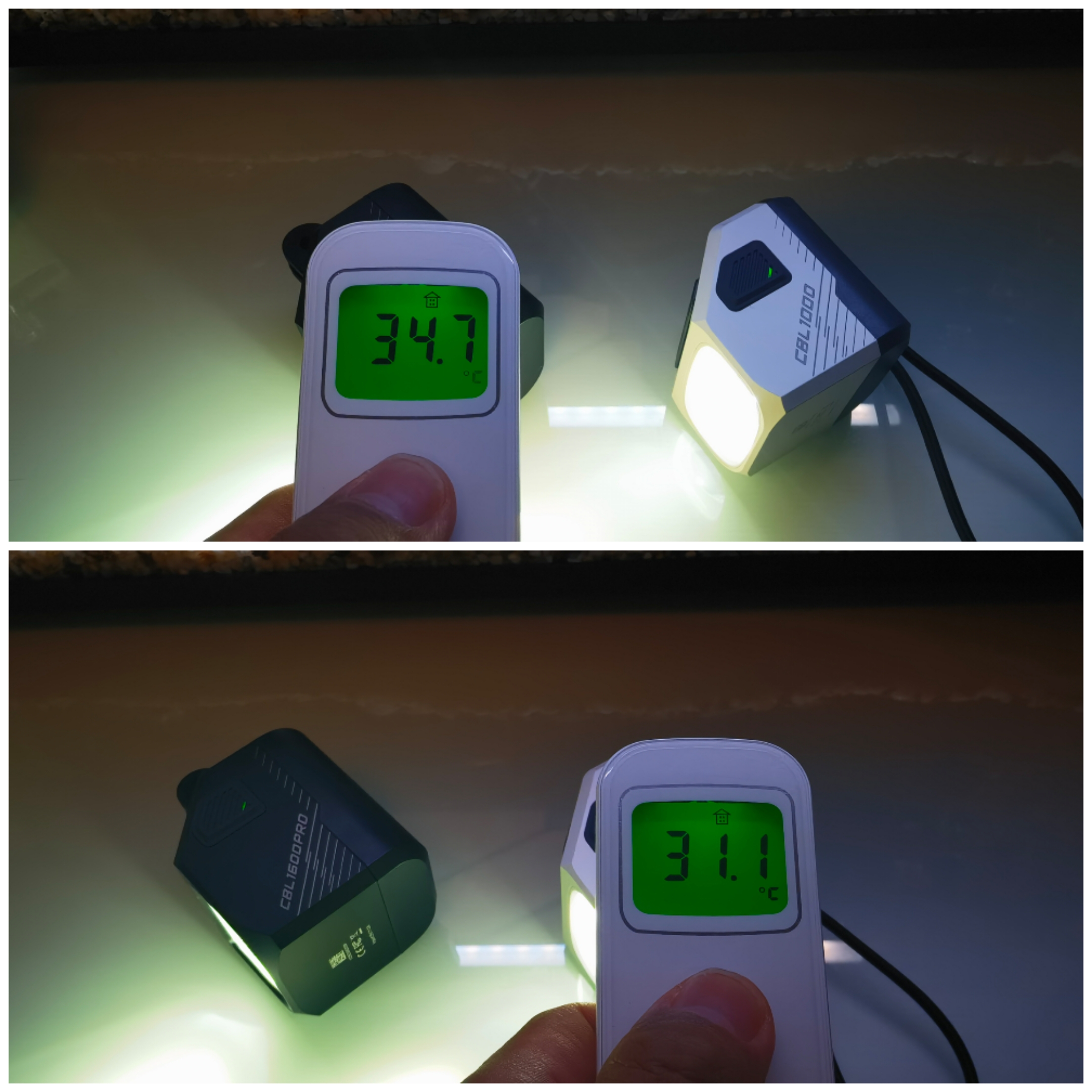 CBL1600PRO和CBL1000均为铝合金机身,长时间开灯发热都控制的很好。上面两个灯是我同时开灯,最大档一个小时之后的测温,如上图,CBL1600PRO由于功率更大,测的温度是34.7℃,CBL1000测的温度是31.1℃,虽然高了三度多一点,但是区别不太大,毕竟还没有咱们人体的体温高。因为是在室内,并不像骑行那样会有行进中的空气强对流,这种条件下测试其实是不利于散热的,由此可见我们不用为发热担心。