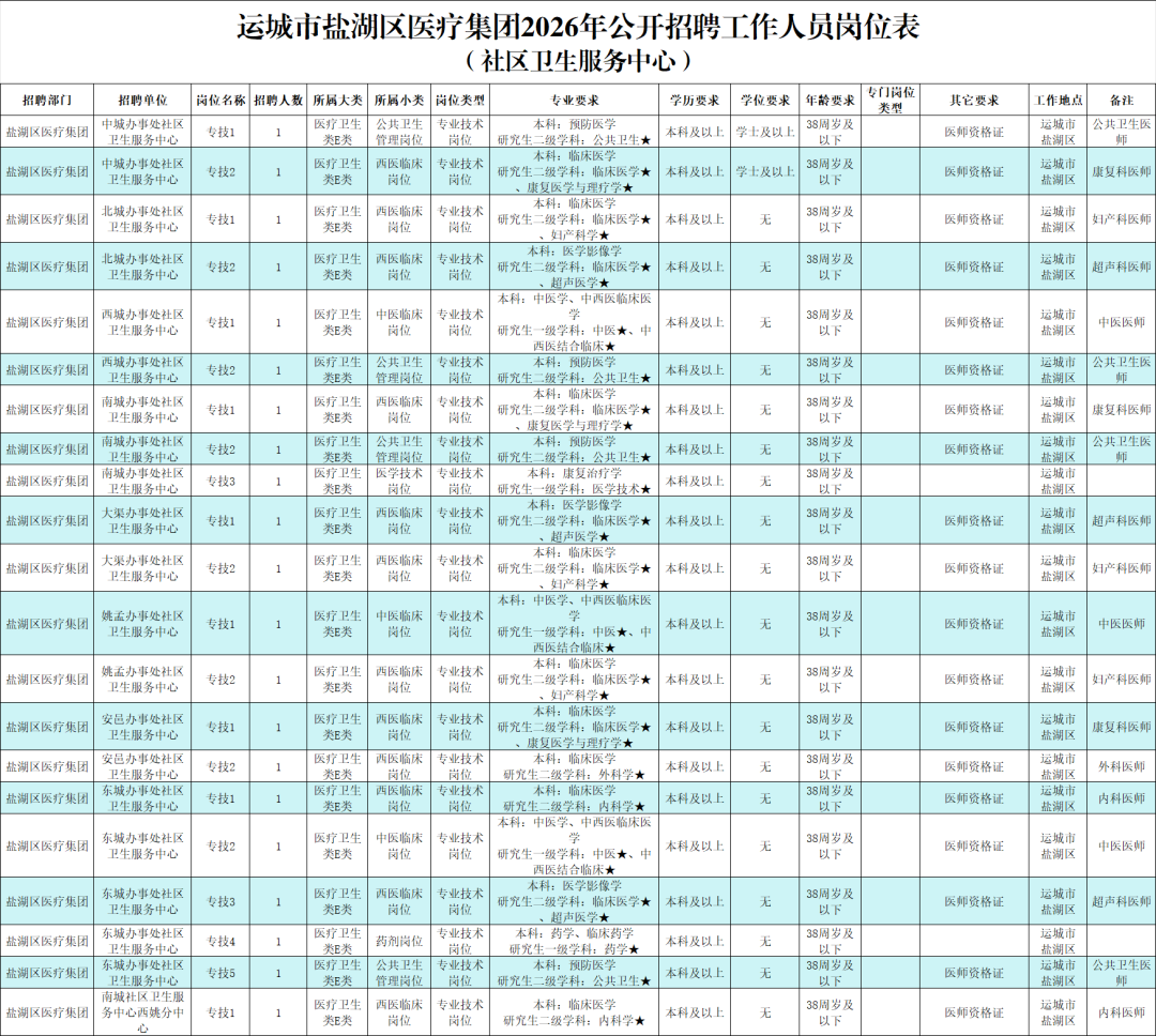 山西省2026年事业单位公开招聘开始啦!盐湖区医疗集团招聘正式在编人员47人,其中盐湖区人民医院15人、社区卫生服务中心21人、乡镇卫生院11人。具体要求详见岗位一览表,请符合条件人员积极报名,我们期待您的加入!