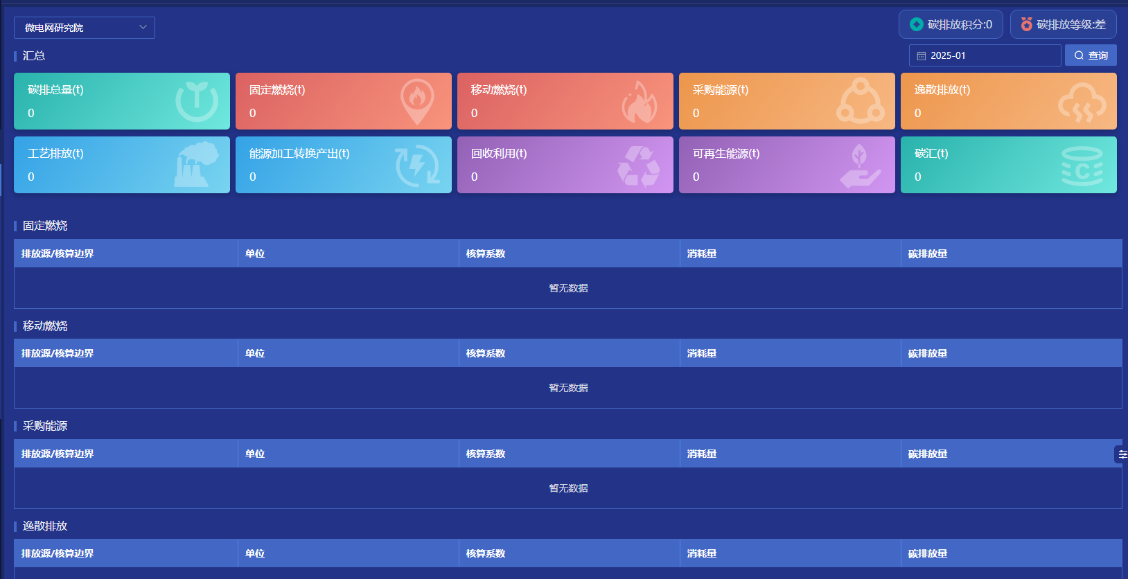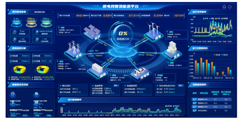 “源网荷储”等全量运行数据,存储展示、状态检测、运行告警;直观展示微电网系统电量、碳排、成本、设备运行等各类数据。