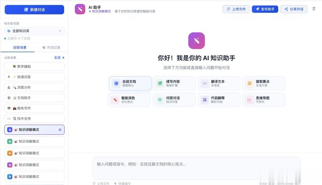 精准检索:基于向量数据库的语义搜索,理解你的真实意图 文档总结:上传长篇文档,AI 自动提取核心要点 智能续写:输入开头,AI 帮你完成后续内容 多语言翻译:支持中英日韩等多语言互译 思维导图:自动生成知识结构图,理清思路2. 知识库管理