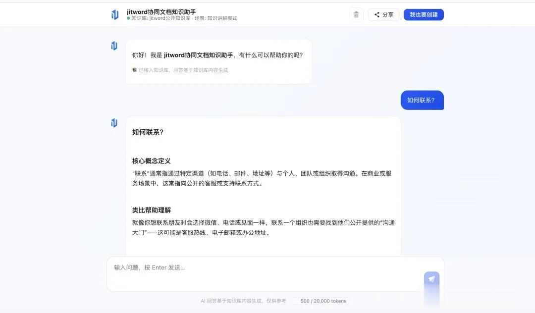 可以自定义提示词,场景模版,AI助手权限控制,快捷短语等,发布之后就能即刻为你“板砖”,下面是我发布的一个JitWord AI助手,大家对JitWord 有任何问题,也欢迎随时和它交流: