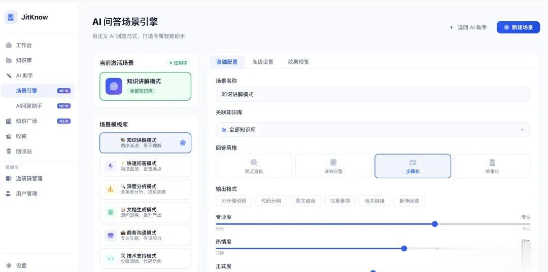 场景引擎模块我们预设了多种 AI 应用场景,开箱即用。大家还可以根据自己的需求,自定义场景模版,并应用到自己的AI客服中。