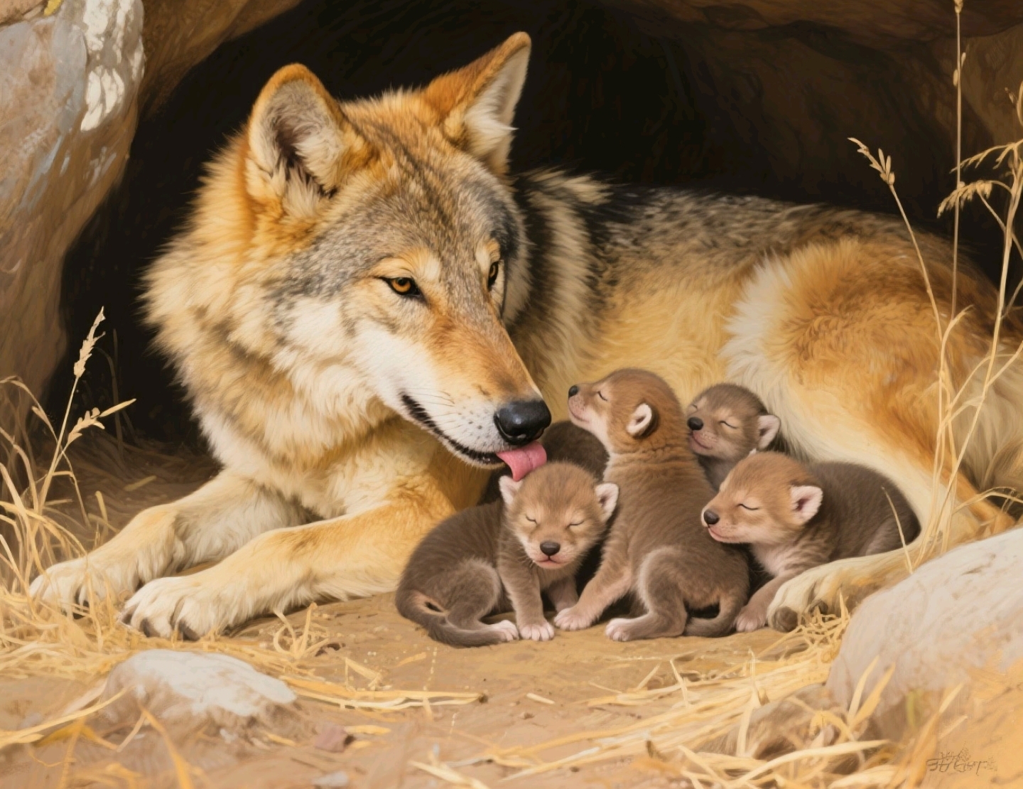 紫岚一共生下三只公狼崽,一只母狼崽,三只公狼分别叫黑仔、蓝魂儿、双毛,一只母狼叫媚媚。