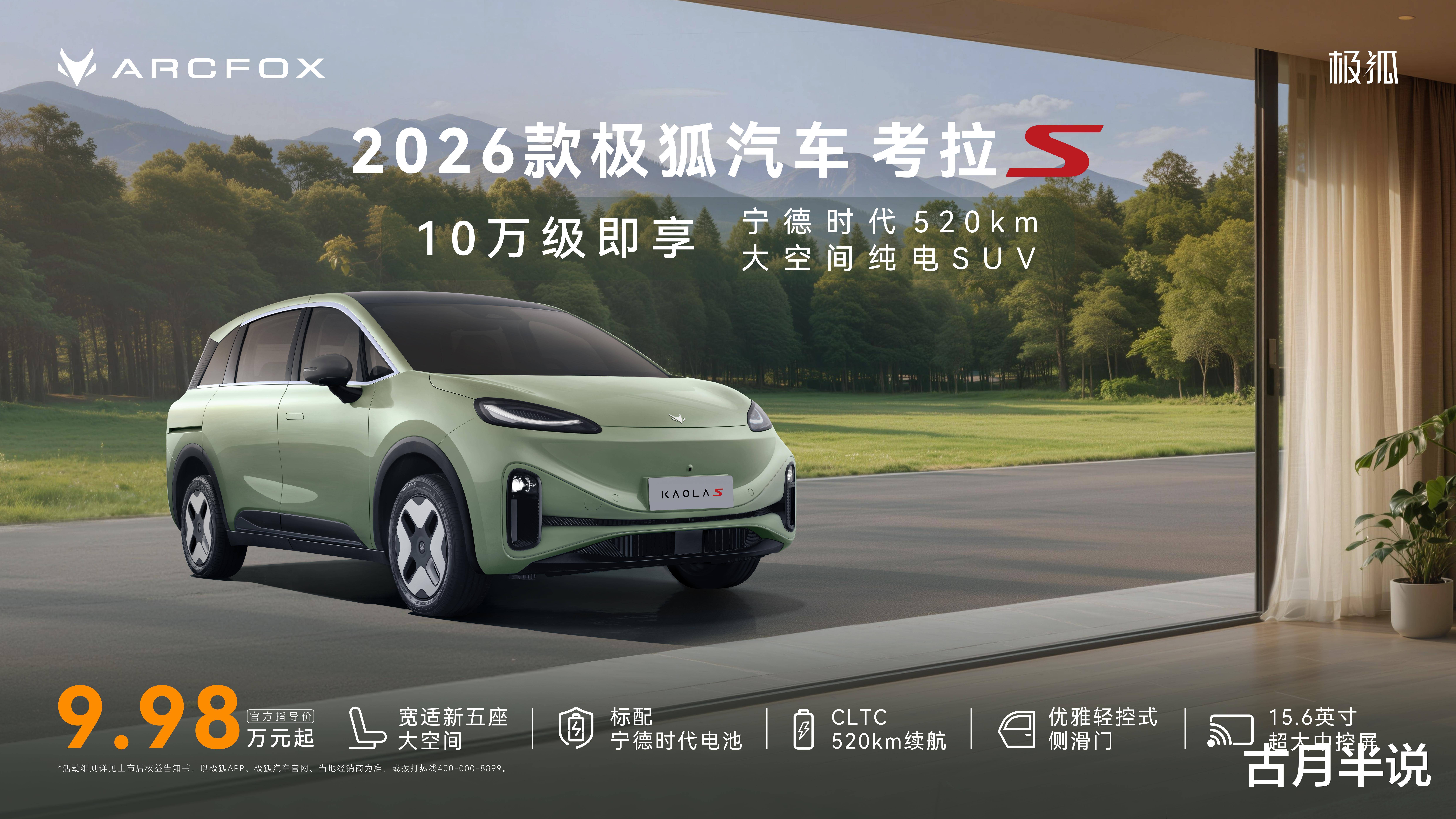 2026年1月13日,极狐汽车官方指导价9.98万元起的考拉S横空出世。宁德时代电池520公里续航、15.6英寸中控屏、同级独有的侧滑门,加上“电池自燃烧一赔一”等三重承诺,这款五座纯电SUV在配置单上几乎找不到短板。