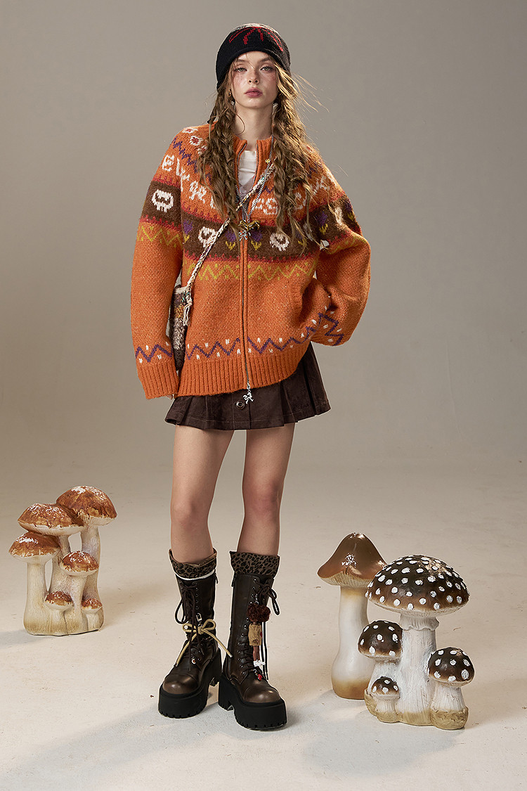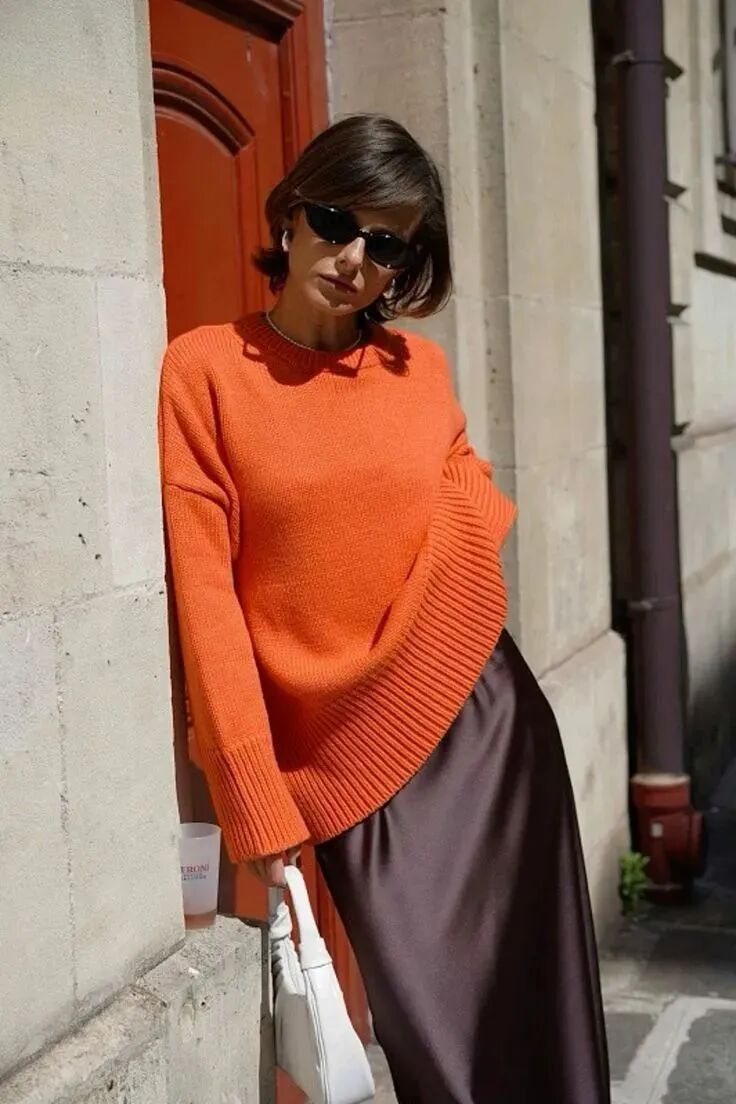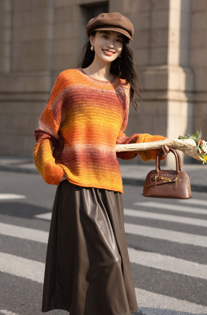 橙色大毛衣自带暖意,宽松版型藏肉又舒服,显白提气不挑皮。配棕色短裙刚好平衡上装的宽松,上宽下窄优化比例,日常穿温柔又耐看,通勤、逛街都适配。