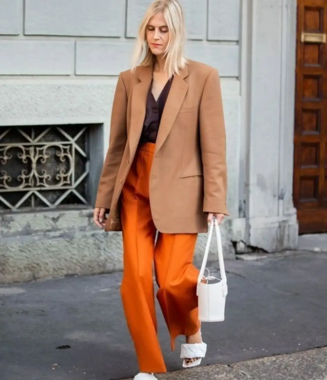 不想大面积撞色?用蓝色小单品点缀!橙色 + 棕色主体搭配不变,拎一个蓝色腋下包,或戴一顶蓝色帽子、围一条蓝色围巾。