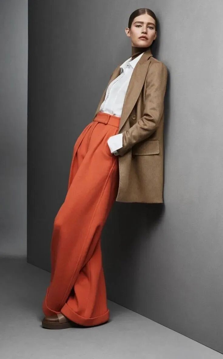 棕色西装外套+白色衬衫+棕色高领衫,配一条橙色阔腿裤,穿一双棕色皮鞋,这个搭配太有暖调高级感了!棕色系上下呼应稳得住整体,白色衬衫中和厚重感,橙色阔腿裤直接点亮造型,复古又不失活力。