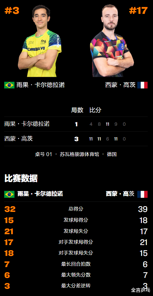 比赛开打后,雨果在首局状态不佳,很快便在场上落后比分,并未发挥出自己的强势弧圈球进攻威胁,失误频频的同时被西蒙抓住机会反击,中间段后逐渐崩盘,最终只拿到4分就输掉,由此而无缘先下一城。