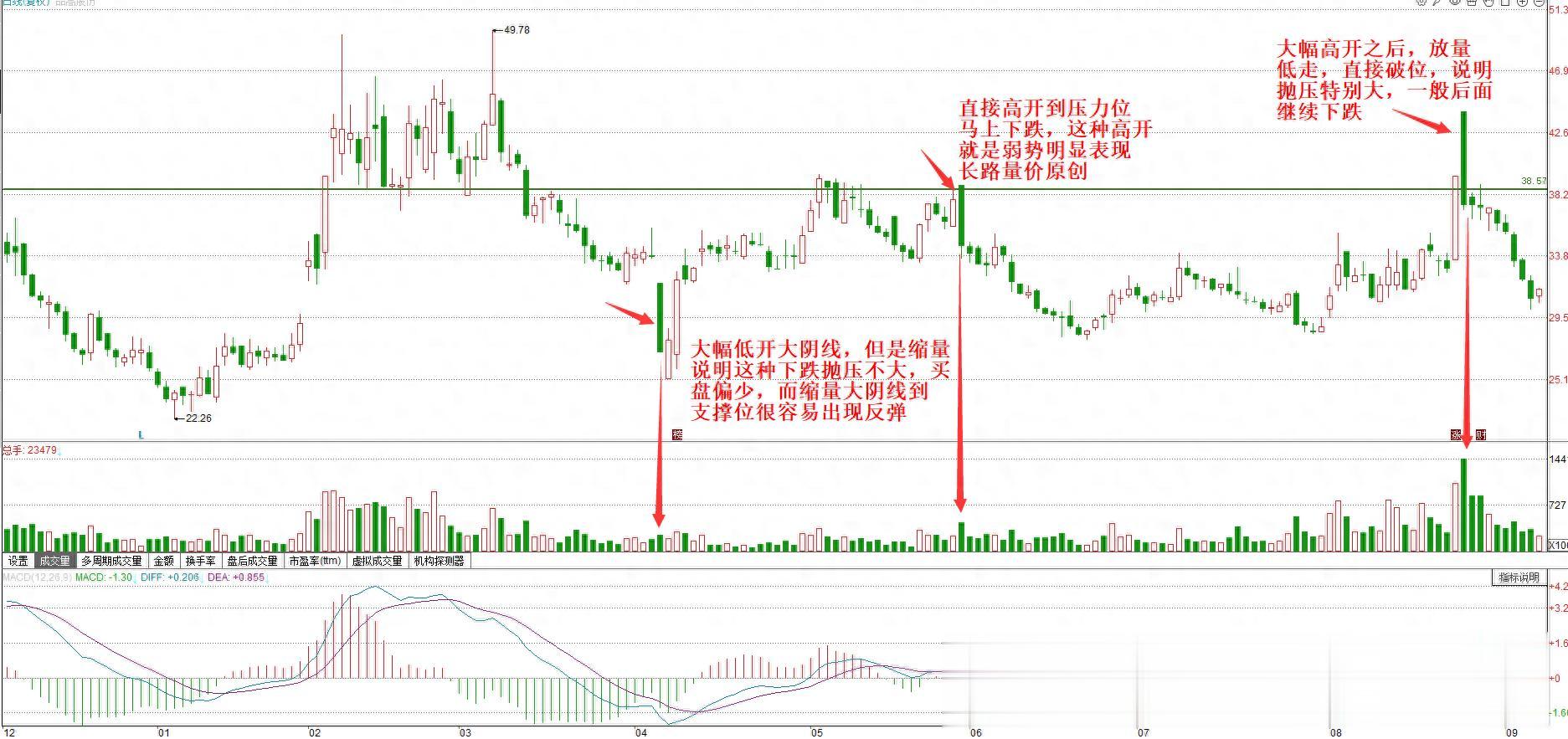 而如果这种大幅高开低走之后的走势,直接破掉了高开过程中,突破上来的支撑,那么这种高开低走的走势,后面继续下跌几乎就是确定的,而且一般放量越大,后面继续下跌的概率是越高,有些比较鸡贼的走势,在这种大幅高开低走并且破位之后,有几天的横盘震荡,但是不管怎么震荡,只要是股价不能吃上放量高开低走的K线,那么就只能看是一种下跌中继的震荡,而不是走强。