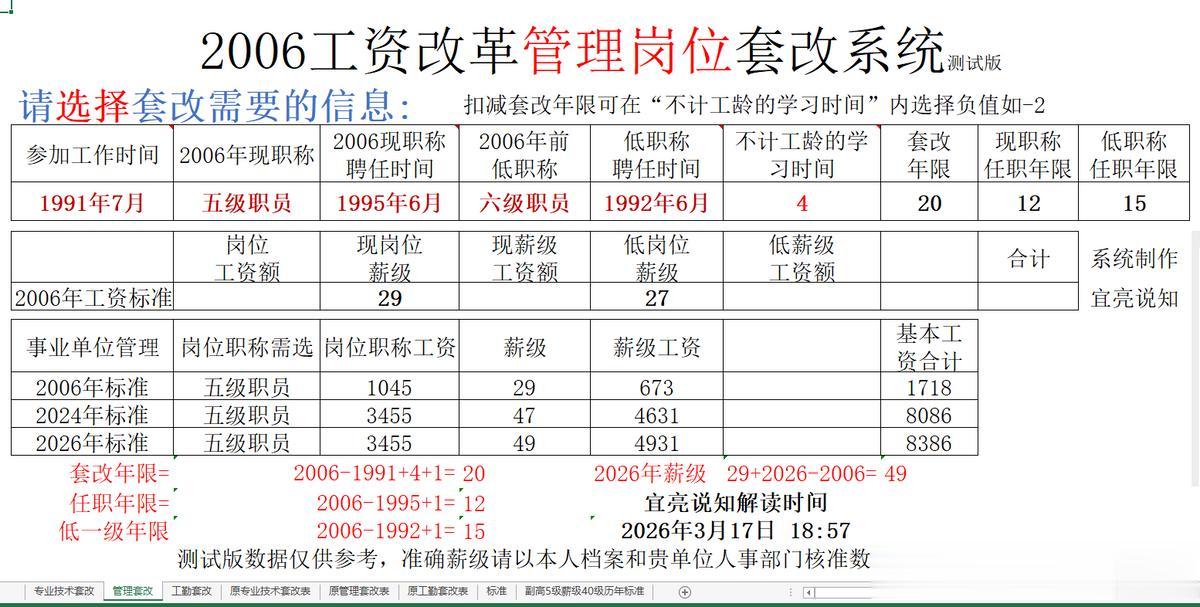 下图是笔者自制的管理岗位套改工具,通过选择,修改参加工作时间、2006年现职称、2006年现职称聘任时间、2006年前低一级职称、2006年前低一级职称聘任时间、不计工龄的学习时间等6个参数,系统将自动确定2006年、2026年的薪级数: