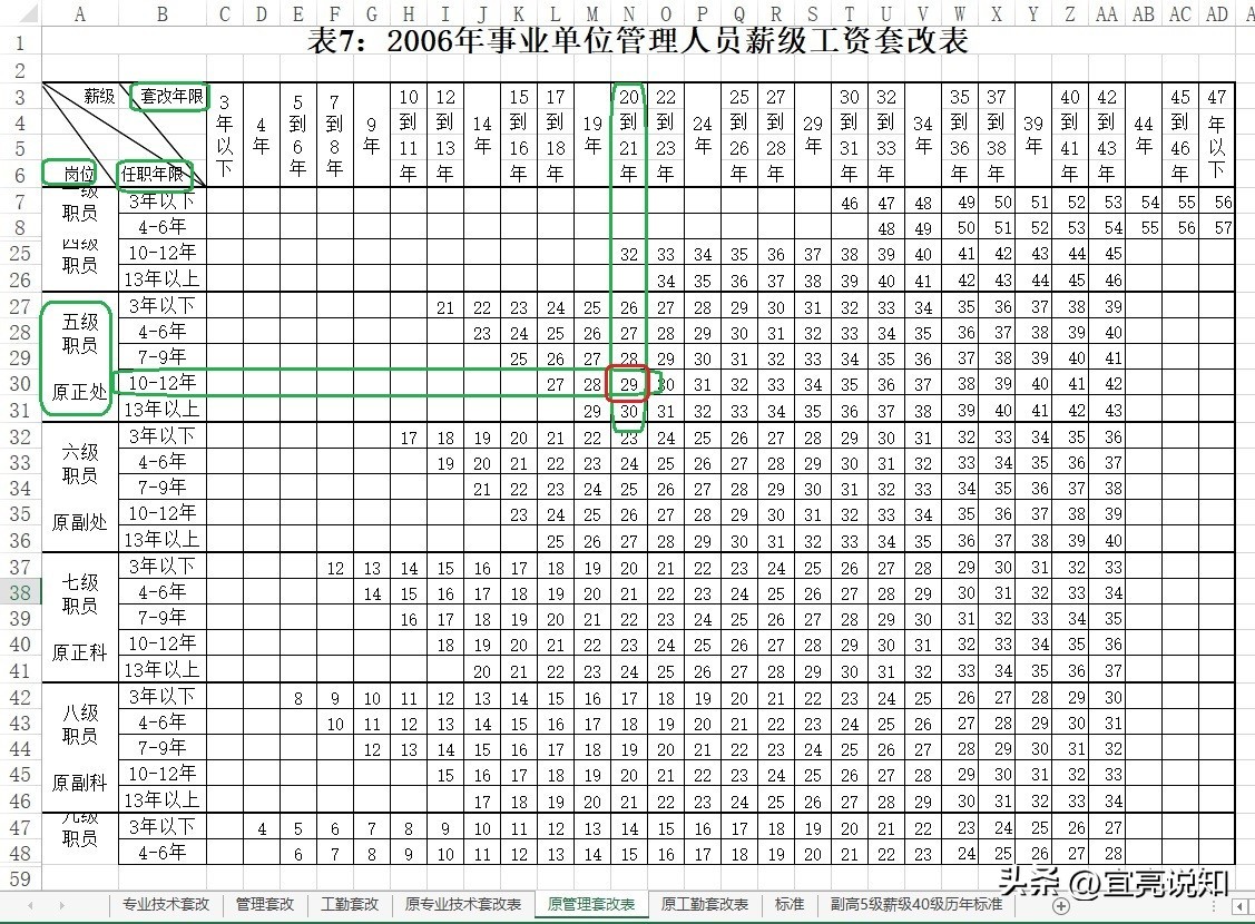 4、在两个方向的交点处,可看到薪级“29”级,即下图表中的红色方框位置。这就是手工套改的薪级数据。