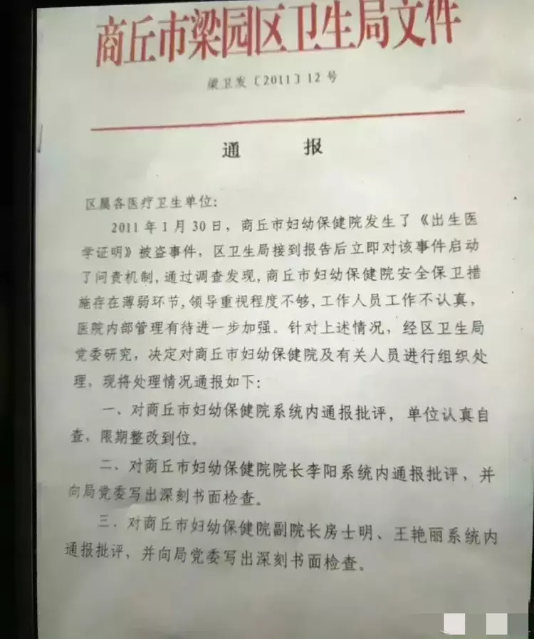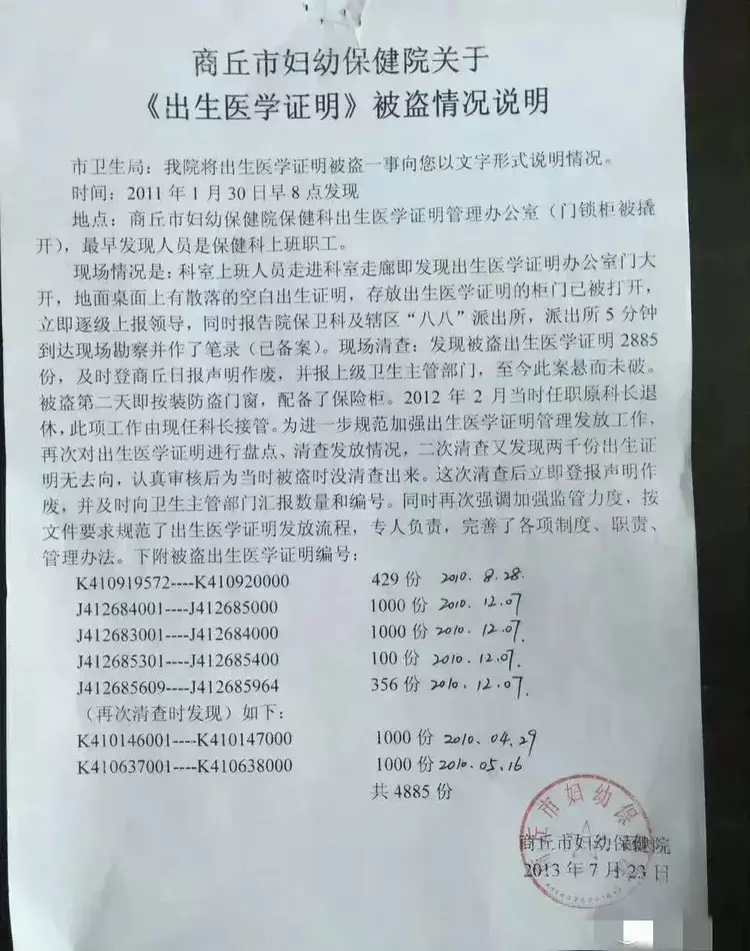 根据上官正义的披露,这起事件发生在2011年1月,河南商丘市妇幼保健院保健科发现大量出生医学证明被盗。起初统计为2885份遗失,但在科室主管换届交接时,再次清点发现另有2000多份不翼而飞。经调查,此事系保健科当时的科长和副科长所为,他们串通盗卖出生医学证明牟利。