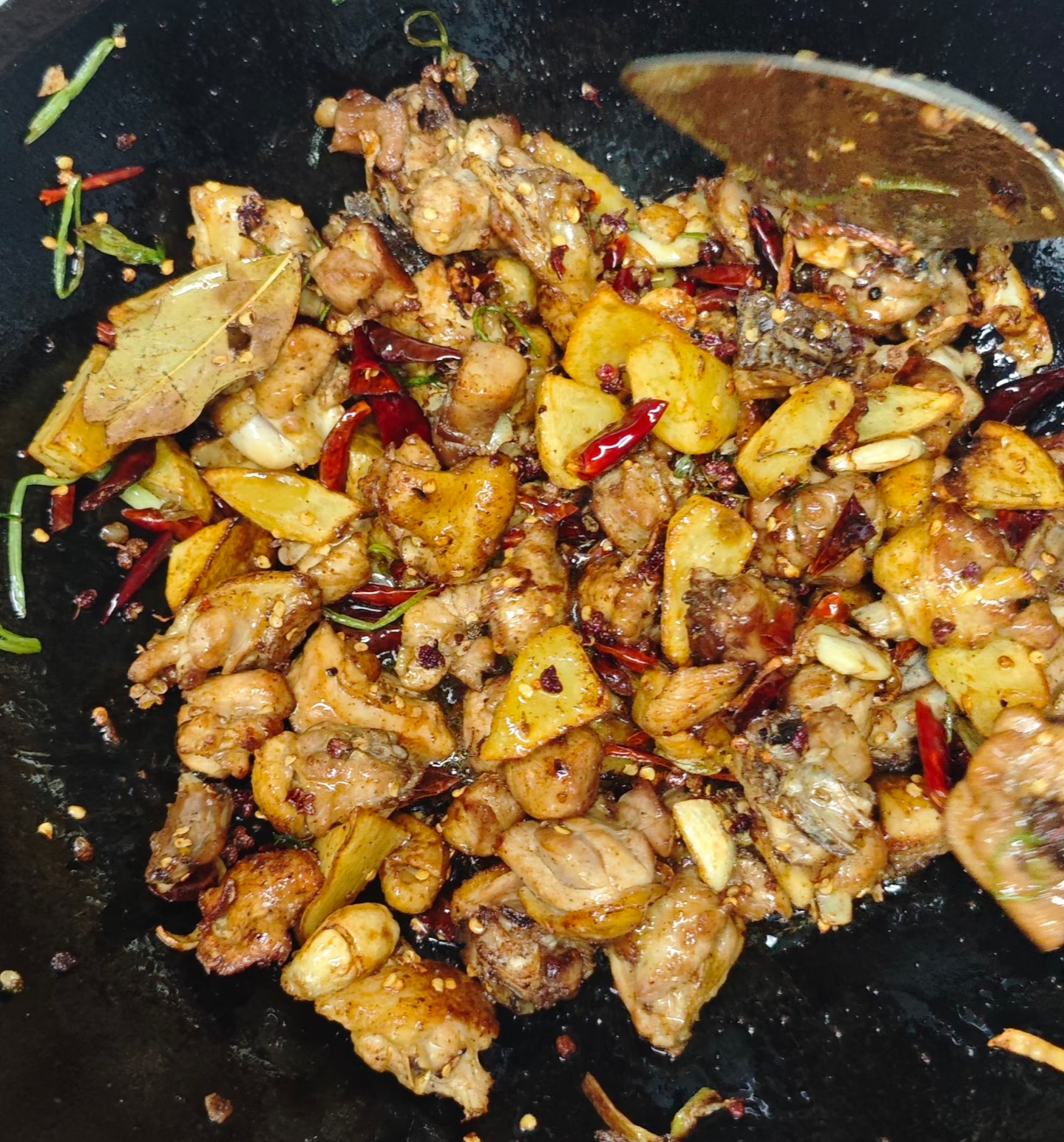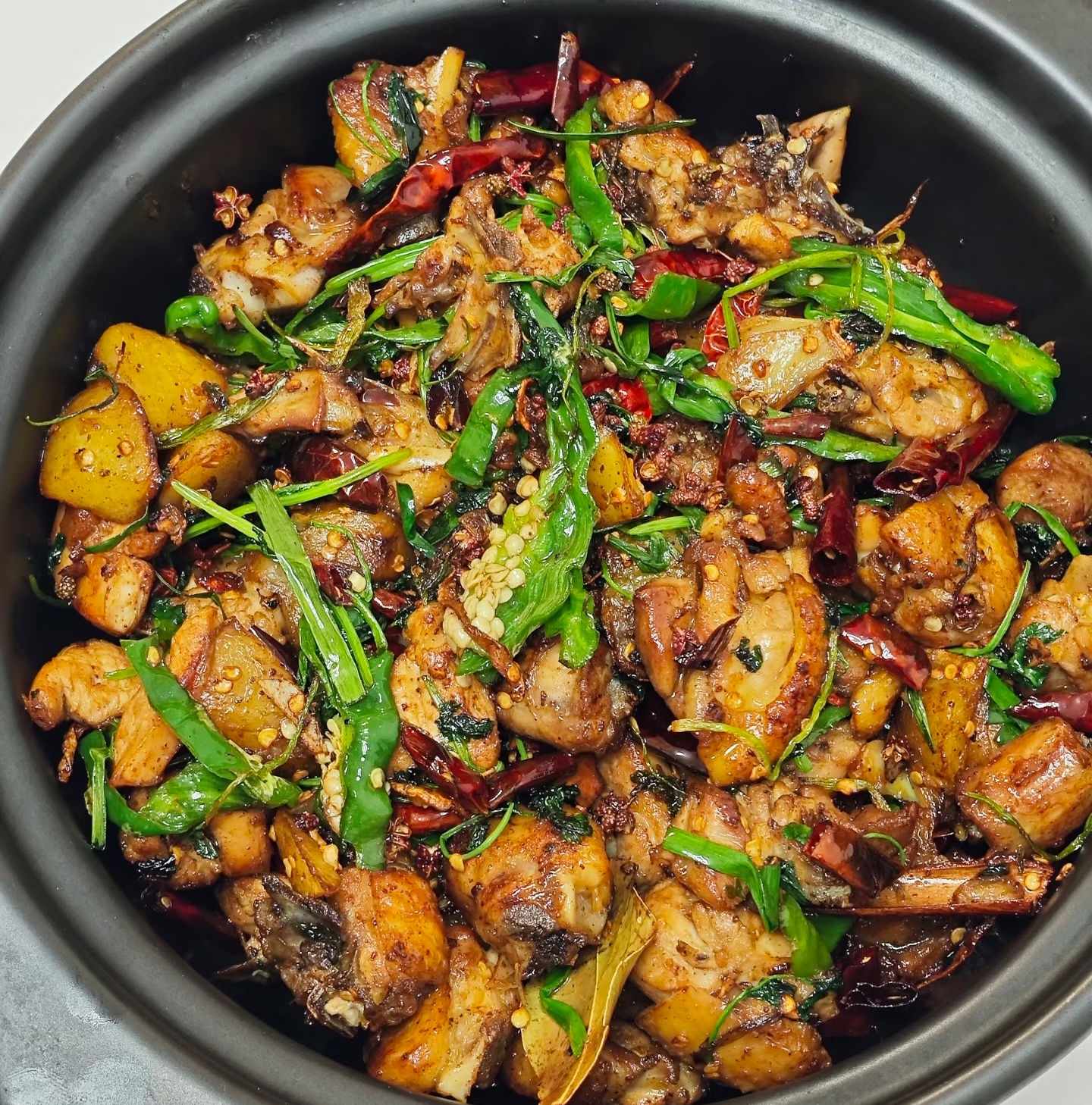 1. 双拼版:加 1 把藕丁或土豆丁,先干煸到边角焦黄再下鸡块,蔬菜吸饱鸡油,麻辣粉糯。