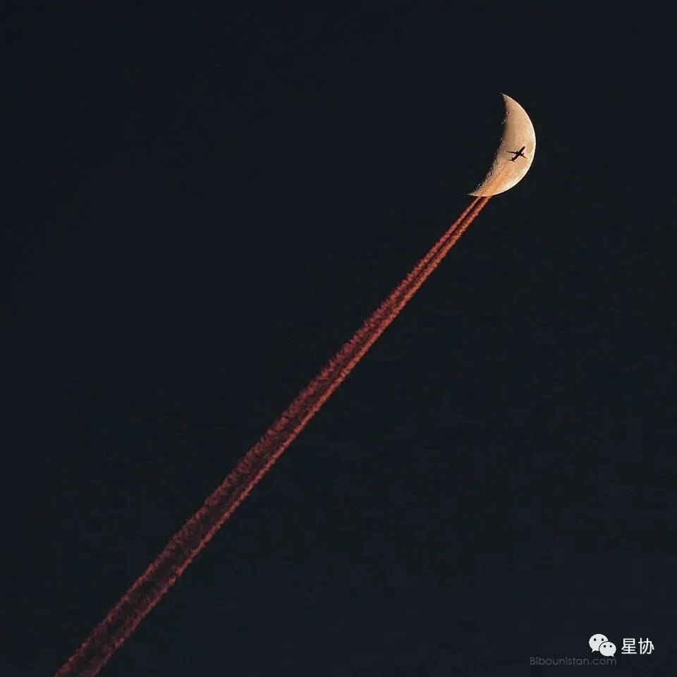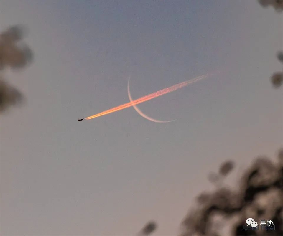 不,这不是一个去月球的好方法。上图所示其实也是一架飞机和月球的偶然重合。这道航迹云通常呈现出白色,但落日方向的大量空气优先驱散了蓝光,使反射的尾迹呈现出亮红色。在飞机后方的远处是一轮同样略微发红的新月。这幅特征影像是一个月前在瑞士瓦莱上空、日落不久之后拍摄的,呈现了天空中仍在阳光下的飞机和航迹云。不幸的是,在几分钟内,即兴的天空表演结束了。这架飞机飞过月球,离开了视线。月球也落下了。这道航迹云变得无光,然后逐渐消散了。【星协科普】