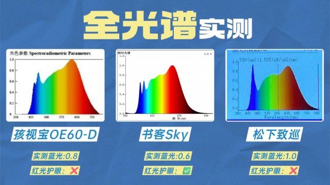 · 孩视宝OE60-D:采用传统的蓝光激发全光谱技术,实测蓝光峰值为0.8,符合安全标准,控制得还算不错,同时光谱整体连续性较好,能满足基础护眼需求。