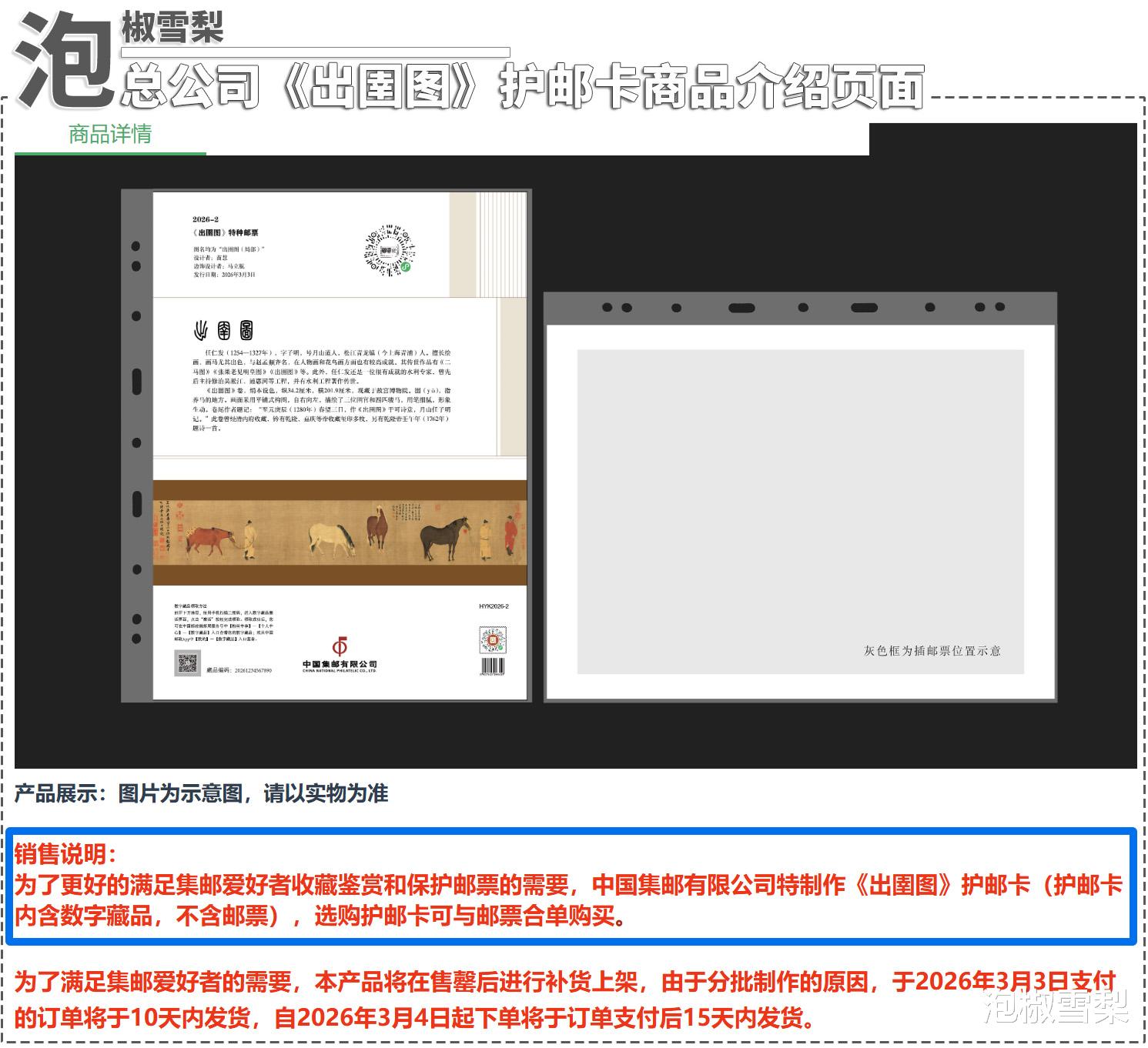 按照总公司的介绍,这次护邮卡可以与《出圉图》邮票寄递合并购买,且售完之后还会继续补货,所以大概率会在每套邮票发行后都推出类似的产品,再在全年邮票发行结束后制作合订本,用以替代没有下文的“本票型年册”。