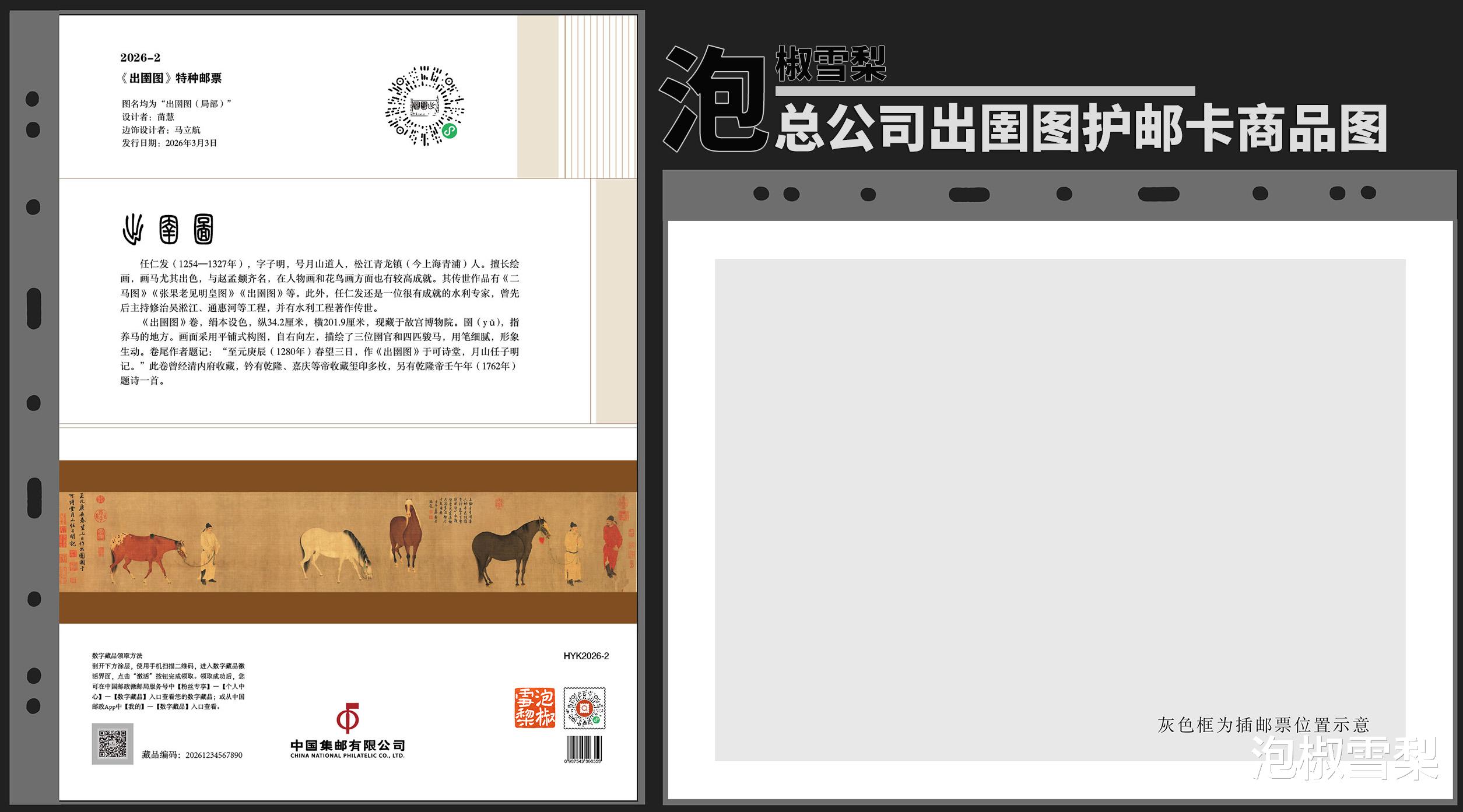 其实这次护邮卡的内容与年册中的介绍页几乎相同,同样包含了总公司小程序入口、邮票基本信息以及邮票主题背景介绍,唯一不同的是增加了《出圉图》原画图案,比年册介绍页的内容丰富一些。