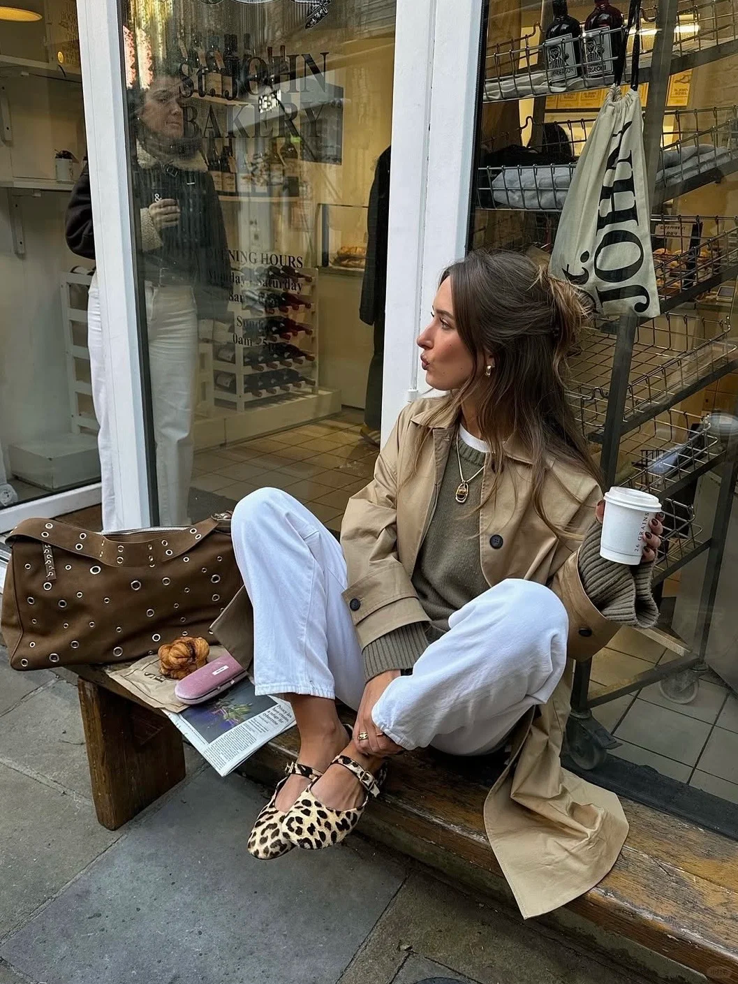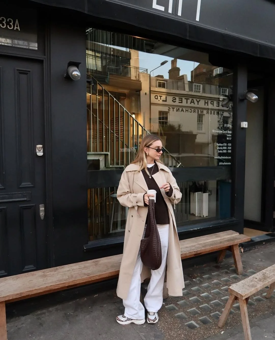 给卡其色风衣内搭 “浅咖毛衣 + 白 T 恤”,再配白色阔腿裤,靠 “同色系叠穿” 营造层次,鞋子与风衣的颜色呼应起来,温柔又利落,通勤或约会穿都合适。