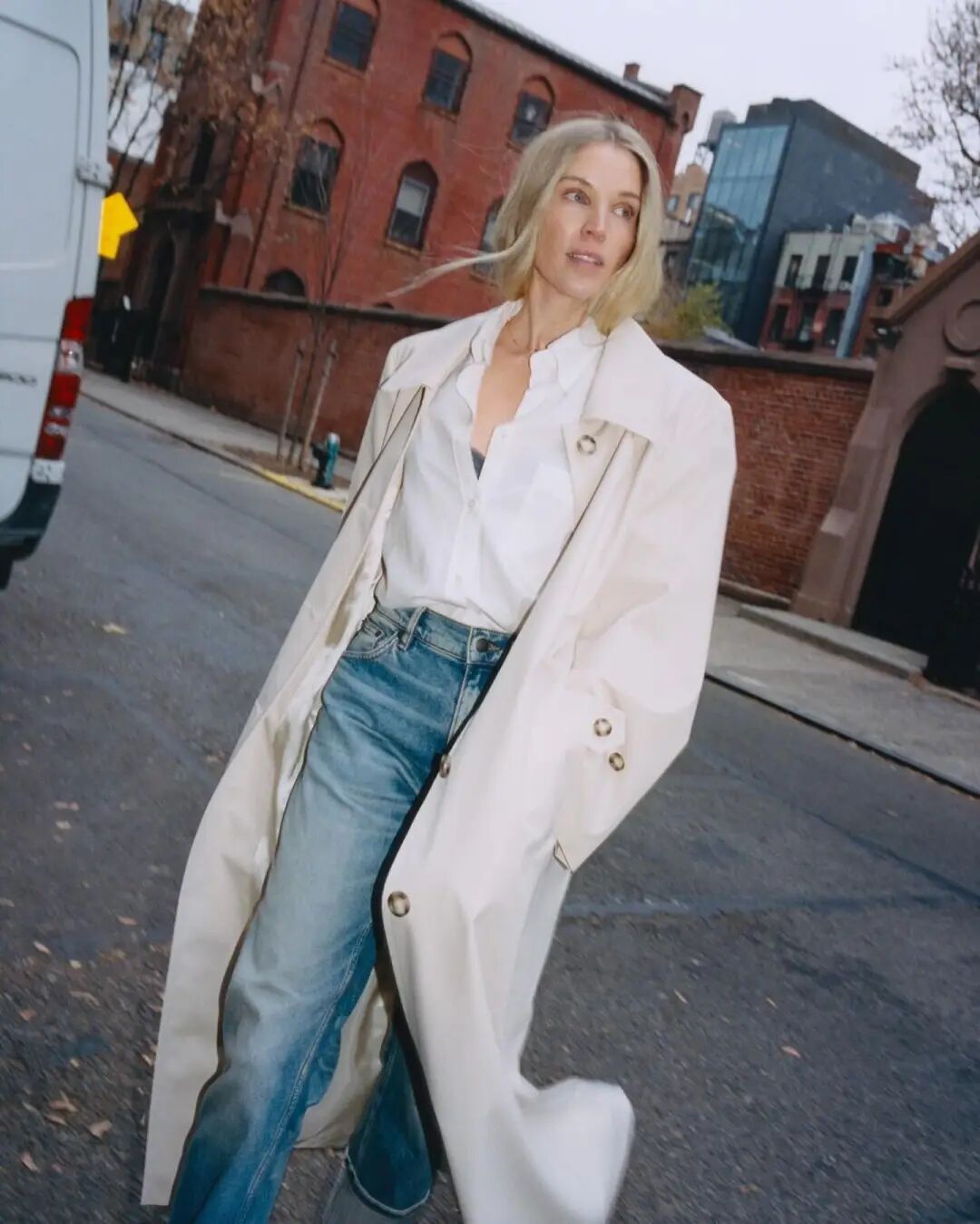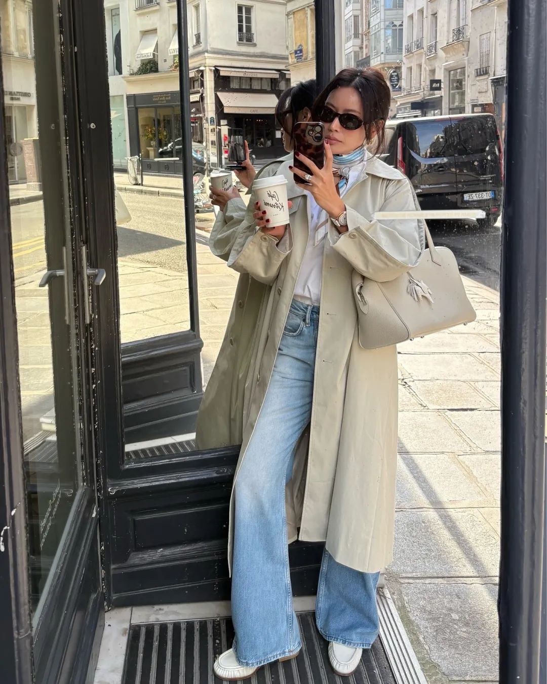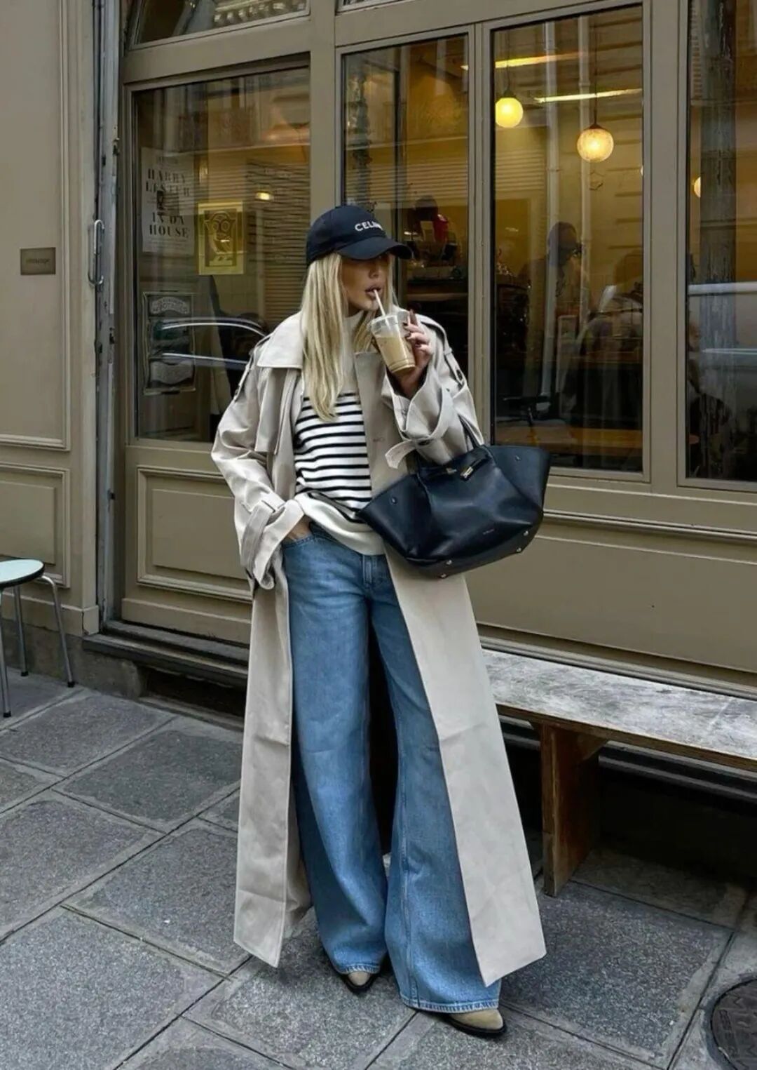 浅卡其色风衣自带温柔滤镜,内搭条纹毛衣、下配蓝色牛仔裤,条纹毛衣非常百搭,和风衣的宽松感形成平衡,松弛又显活力。