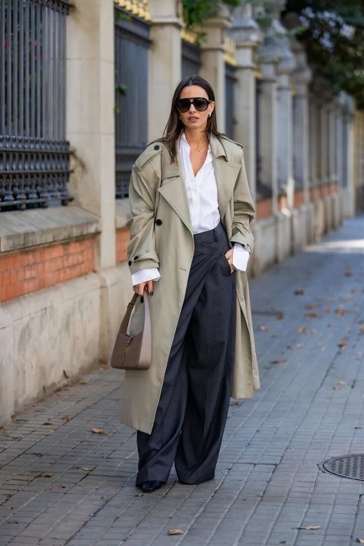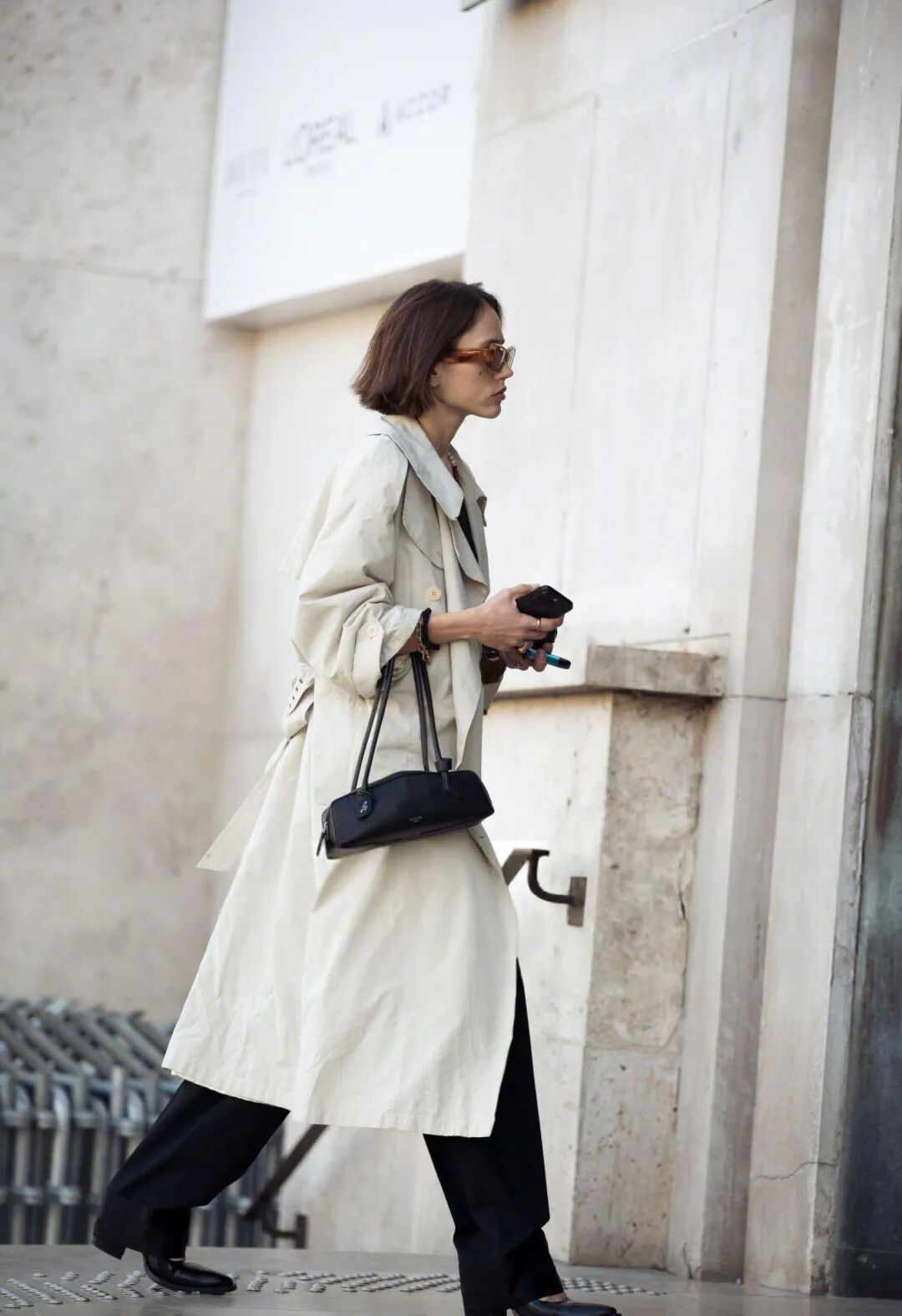 米色长风衣内搭白色衬衫,配一条黑色阔腿裤,拎一个黑色手拿包,穿出时髦又松弛的美感。