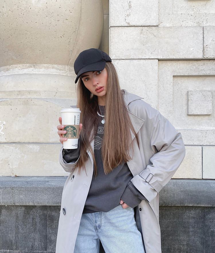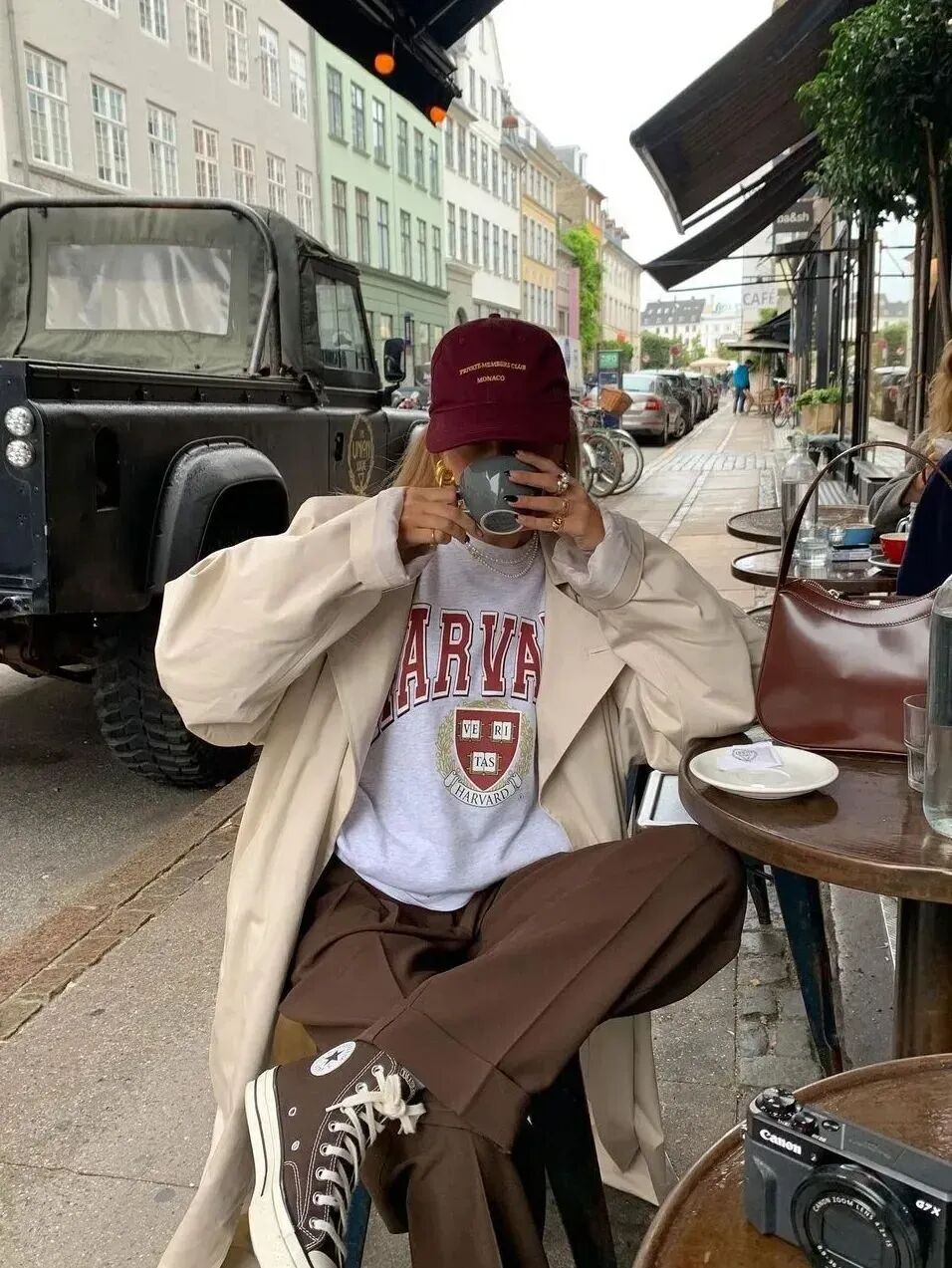 用卫衣当风衣内搭,再搭阔腿裤和棒球帽,既有风衣的气场,又有卫衣的随性,全身都透着 “舒服不紧绷” 的松弛感,降温天穿刚好。