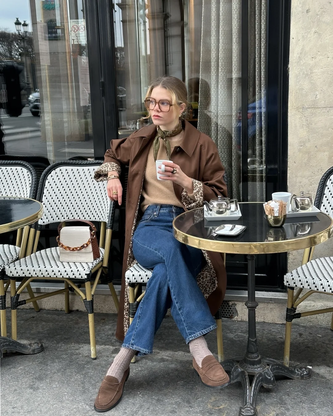 深咖色风衣内搭驼色毛衣,搭配蓝色牛仔裤与深咖色乐福鞋,再用印花丝巾点缀,深咖色与驼色同属大地色系,色调相近且过渡自然,营造出温暖、醇厚的视觉感受。