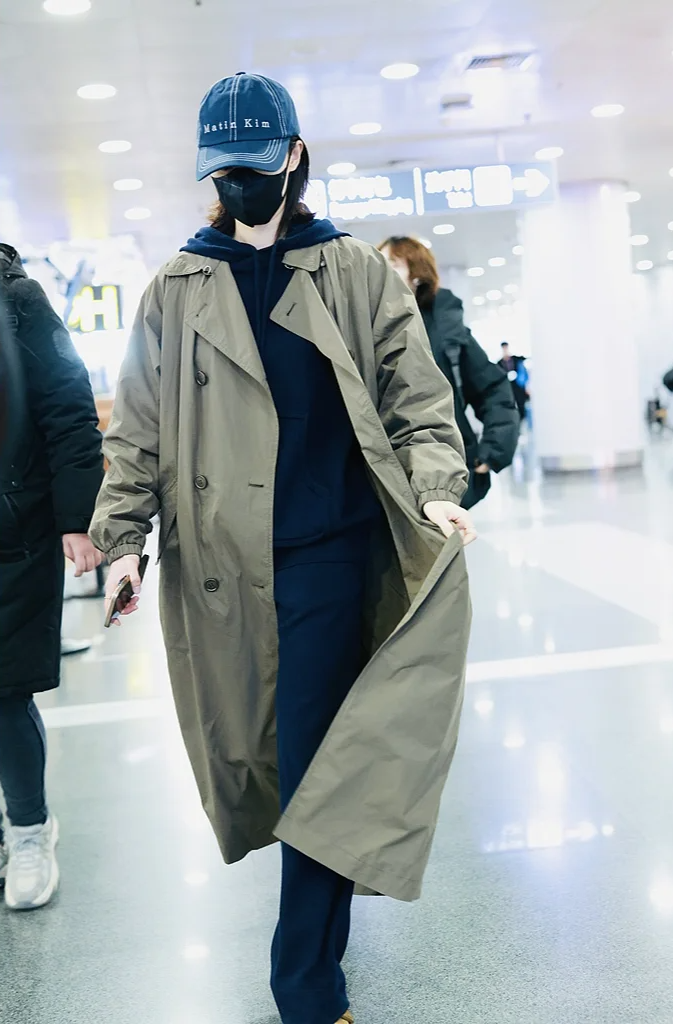 浅咖色长款宽松风衣自带温柔滤镜,内搭黑色连帽卫衣、下配黑色裤子,是 “上宽下顺” 的绝佳组合,既藏肉又显气场。