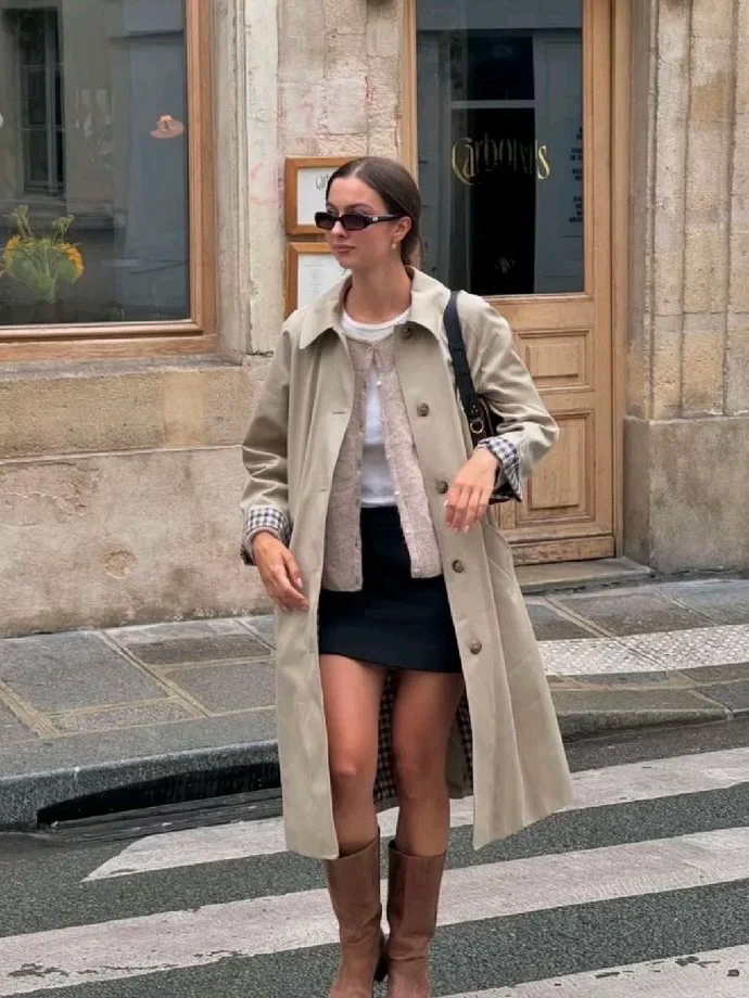 卡其风衣配轻薄内搭和白半裙,经典不出错,重点在 “露层次”。内搭选轻薄针织或衬衫,能和风衣的挺括形成平衡,避免整体显笨重。下身配白色半裙,提亮造型,中和卡其色的沉稳,让搭配更显清爽。