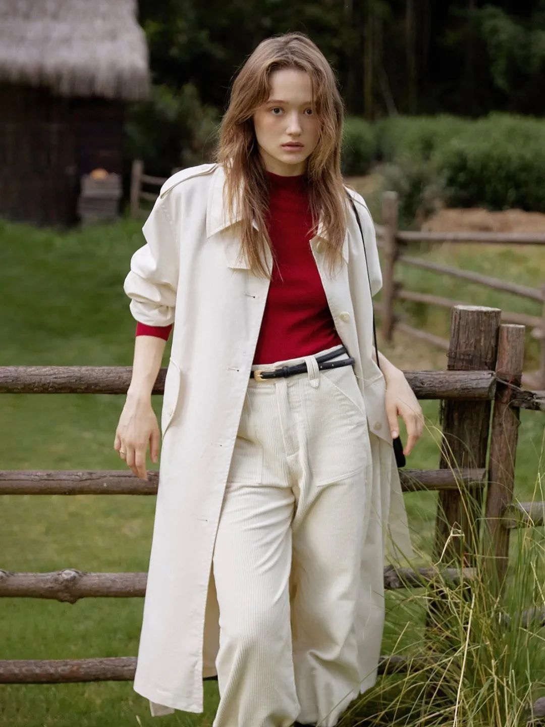 给简洁的白色风衣搭 “浓墨重彩” 的内搭,比如红色针织衫,是最直接的撞色思路。既不会让白色风衣显得寡淡,又能靠红色的鲜活感制造视觉焦点,轻松穿出吸睛却不浮夸的效果。