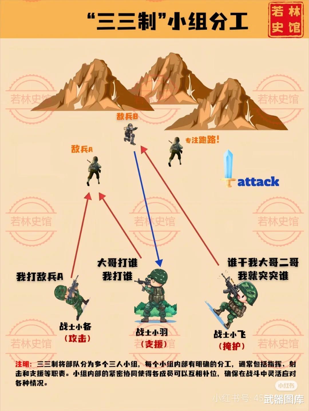 3. 三三制:班组协同的典范结构优势:3人小组呈三角形站位,有效覆盖180°扇面(1950年长津湖战役中,该队形使美军自动武器效率下降60%)