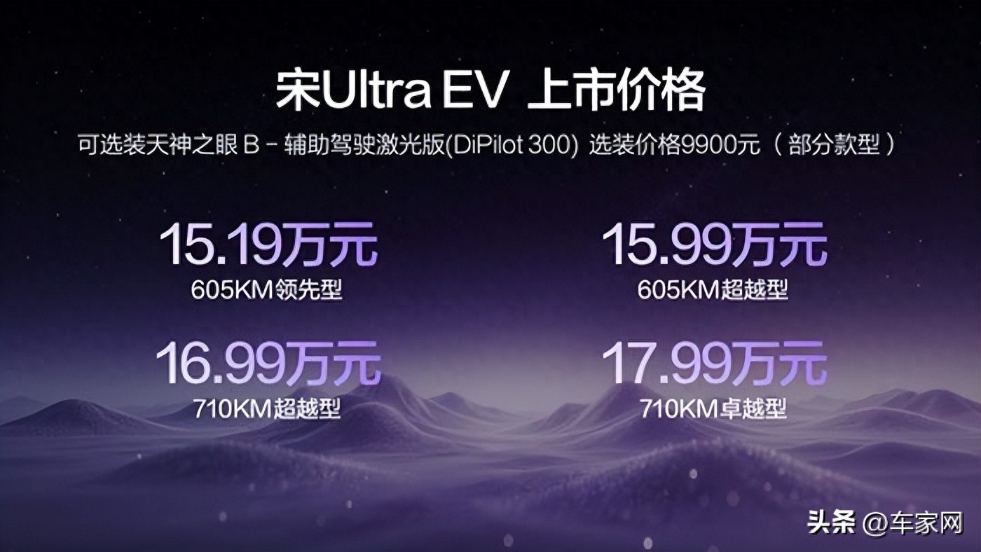 3月26日,比亚迪宋Ultra EV 正式上市,共4款车型,包括605KM领先型、605KM超越型、710KM超越型和710KM卓越型,官方指导价15.19万-17.99万元。