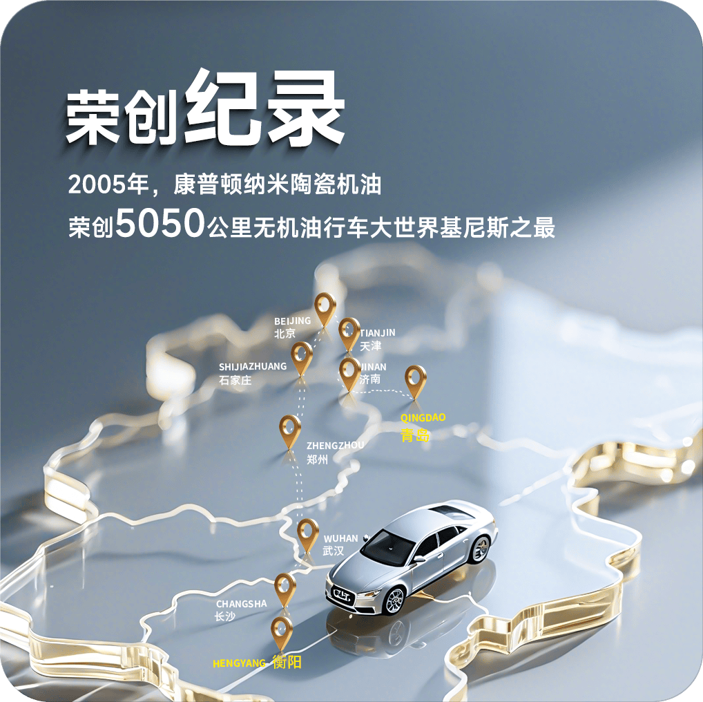 同年12月26日至30日,康普顿纳米陶瓷机油完成一项行业壮举:在“无机油行车”挑战中,成功行驶5050 公里,创下大世界基尼斯纪录,用实际性能证明了其超强的抗磨保护与引擎修复能力。自此,康普顿纳米陶瓷机油成为全球润滑油市场中,在“降低摩擦、抗磨保护、引擎修复” 三大核心领域的高性能产品的代表,并先后斩获中国产学研合作创新成果优秀奖、交通运输部节能推荐产品、省级科技进步一等奖、国家技术发明奖等多项重量级荣誉,技术实力与产品品质获得全行业认可。