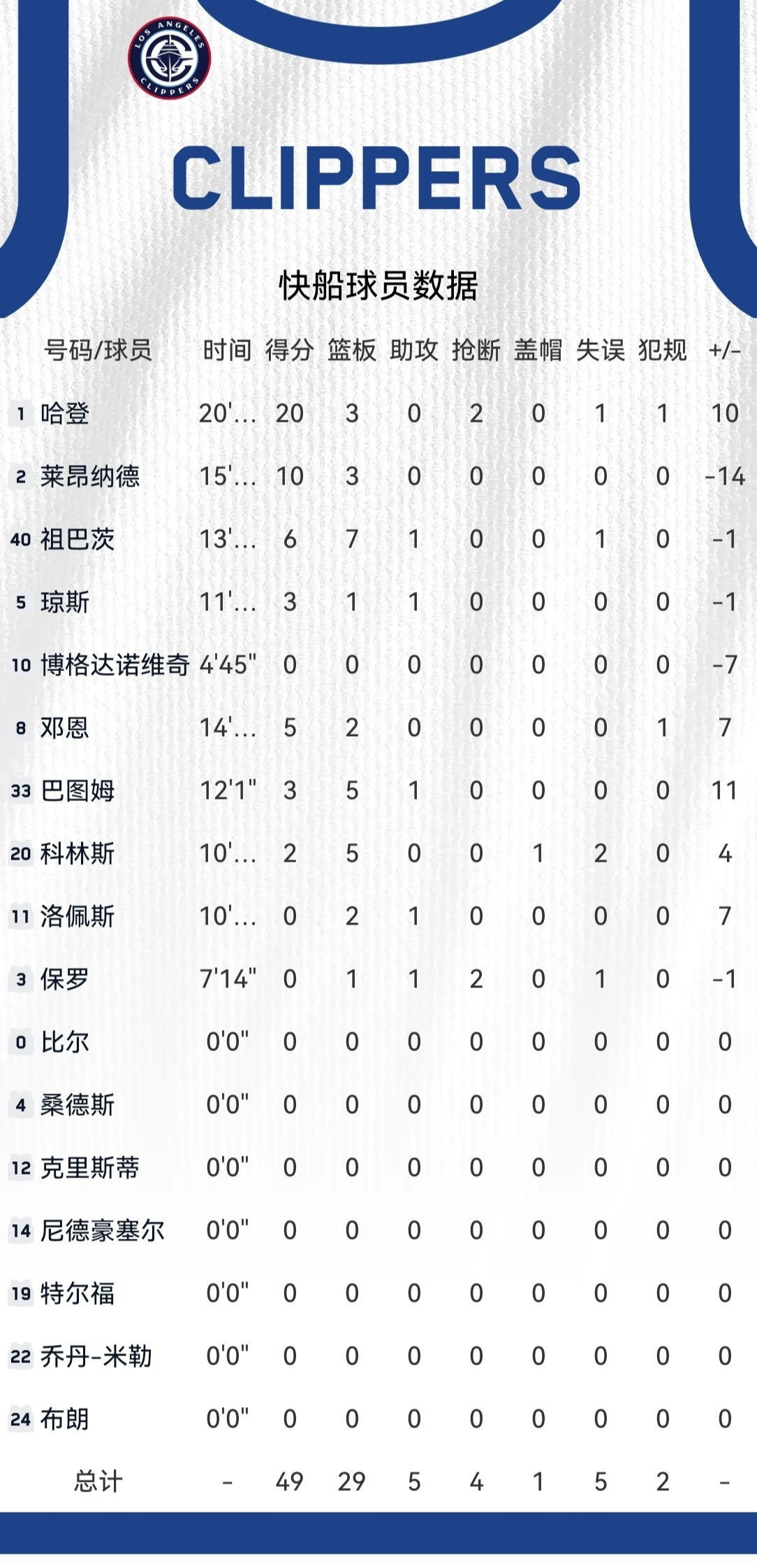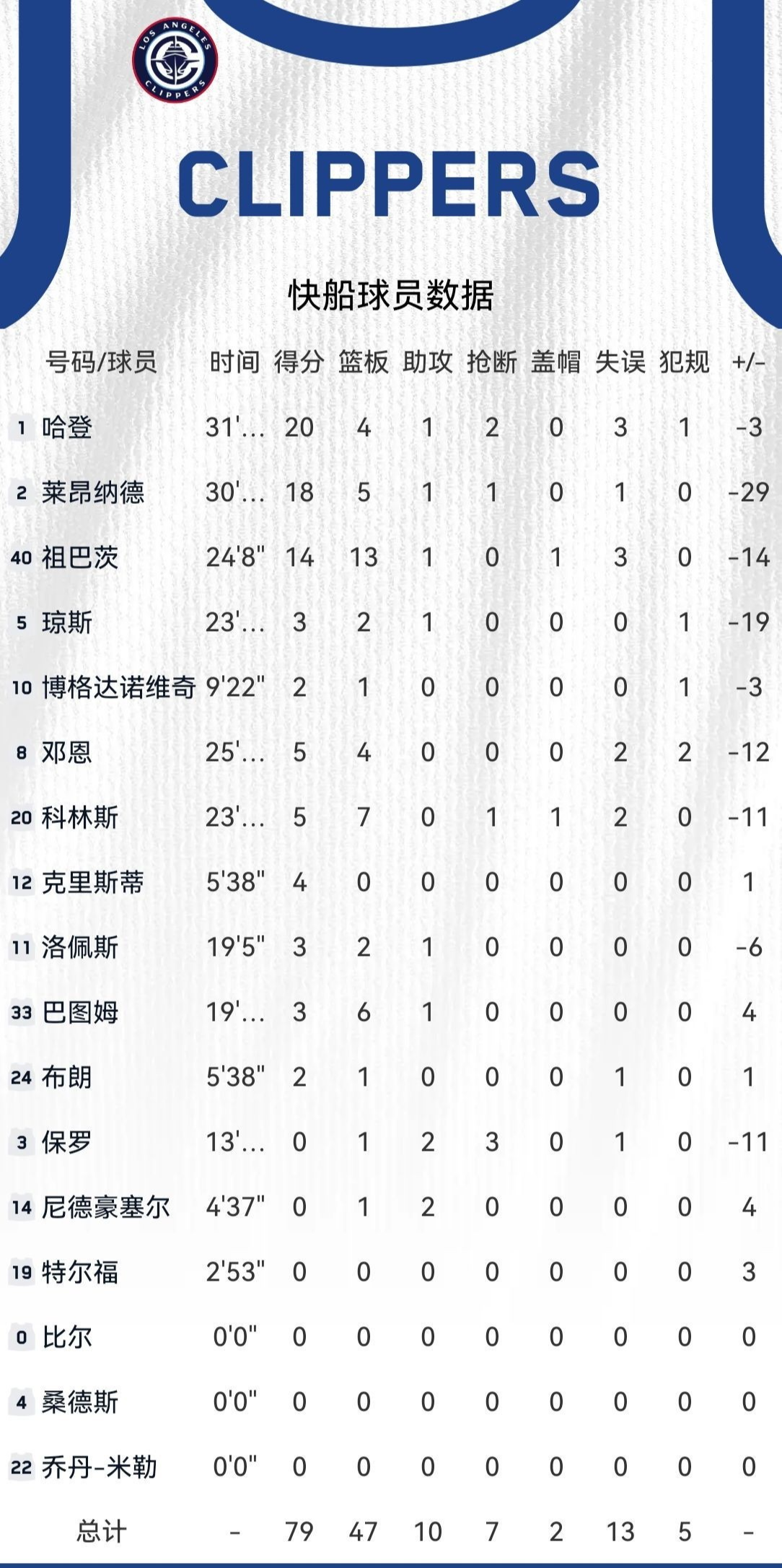 球员表现方面:快船队这边,哈登出场20多分钟,拿下20分3篮板2抢断,还有1次失误和1次犯规,正负值达到+10,进攻端打得很有侵略性,是球队上半场得分的主要保障。莱昂纳德出场15分钟左右,贡献10分3篮板,进攻效率也不错。祖巴茨出场13分钟,拿到6分7篮板1助攻1失误,在内线抢篮板挺积极。琼斯出场11分钟,有3分1篮板1助攻入账。