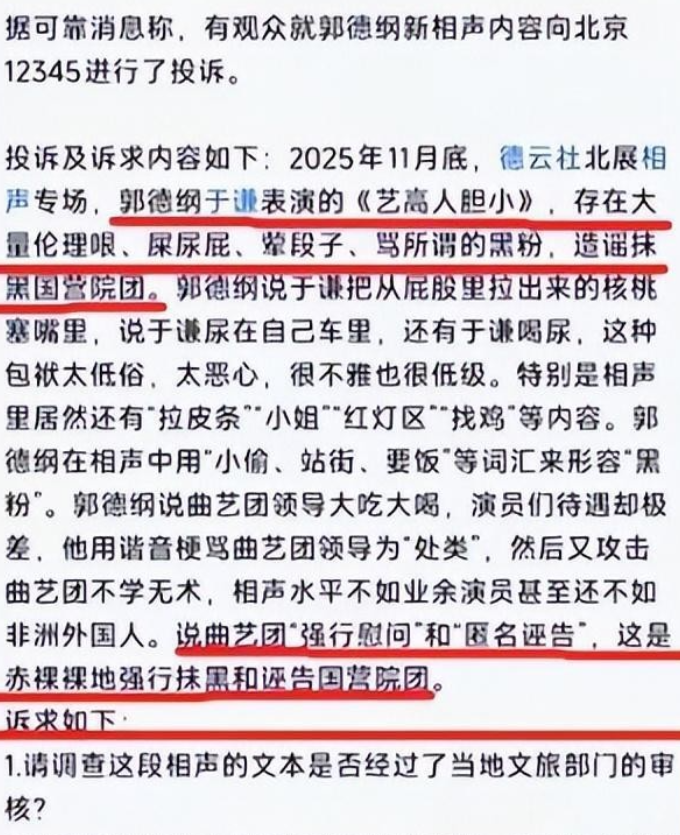 11月底,郭德纲与于谦在北展剧场演出《艺高人胆小》,其中十分钟内容被指“低俗”“影射国有院团”。