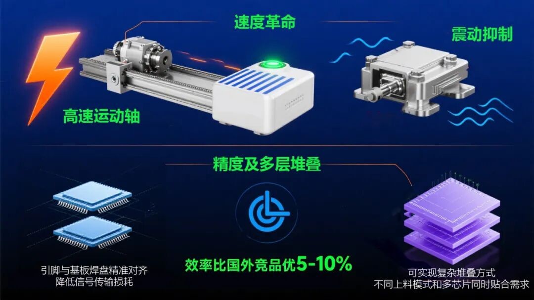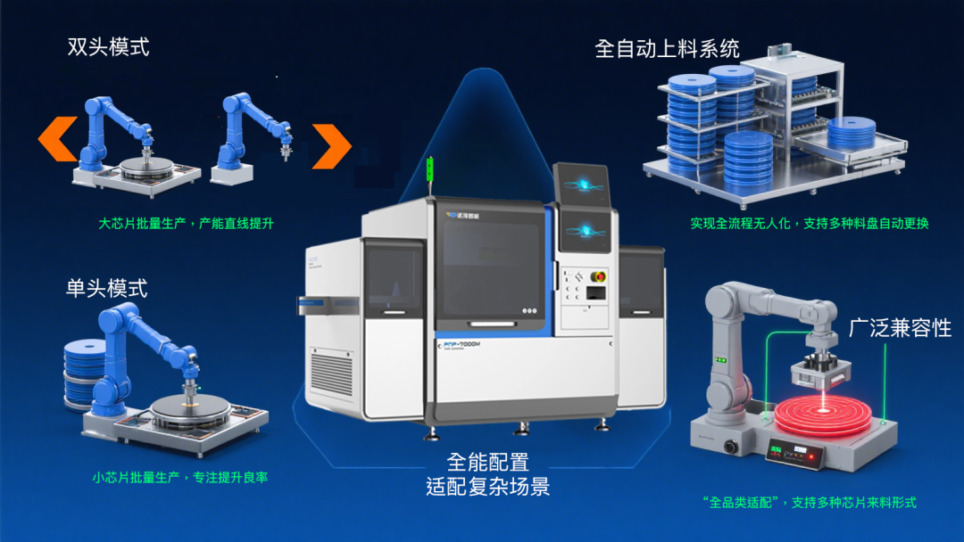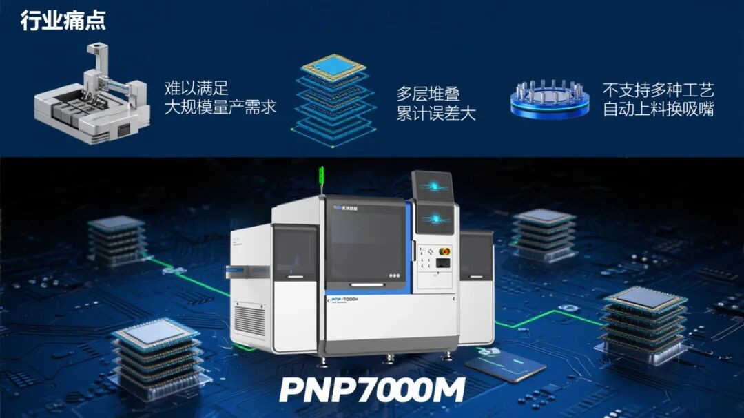 随着 5G、AI、物联网的爆发,存储芯片向 “高密度、大容量、高速度” 演进,堆叠技术是突破物理极限的核心手段。但传统固晶设备面临不少瓶颈:速度难以满足大规模量产需求;多层堆叠时累计误差大,影响芯片性能甚至导致报废;兼容性不足,无法处理超薄芯片、不支持多种工艺和自动上料换吸嘴,限制了高端存储产品研发。而 PNP7000M 的出现,一次性破解了这些难题。