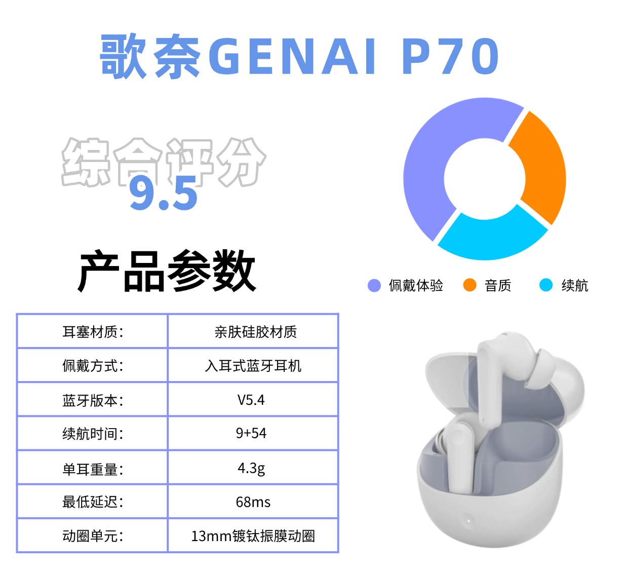 续航:蓝牙5.4,单次9h+总续航54h,快充10分钟听2h,半月一充没有续航的焦虑