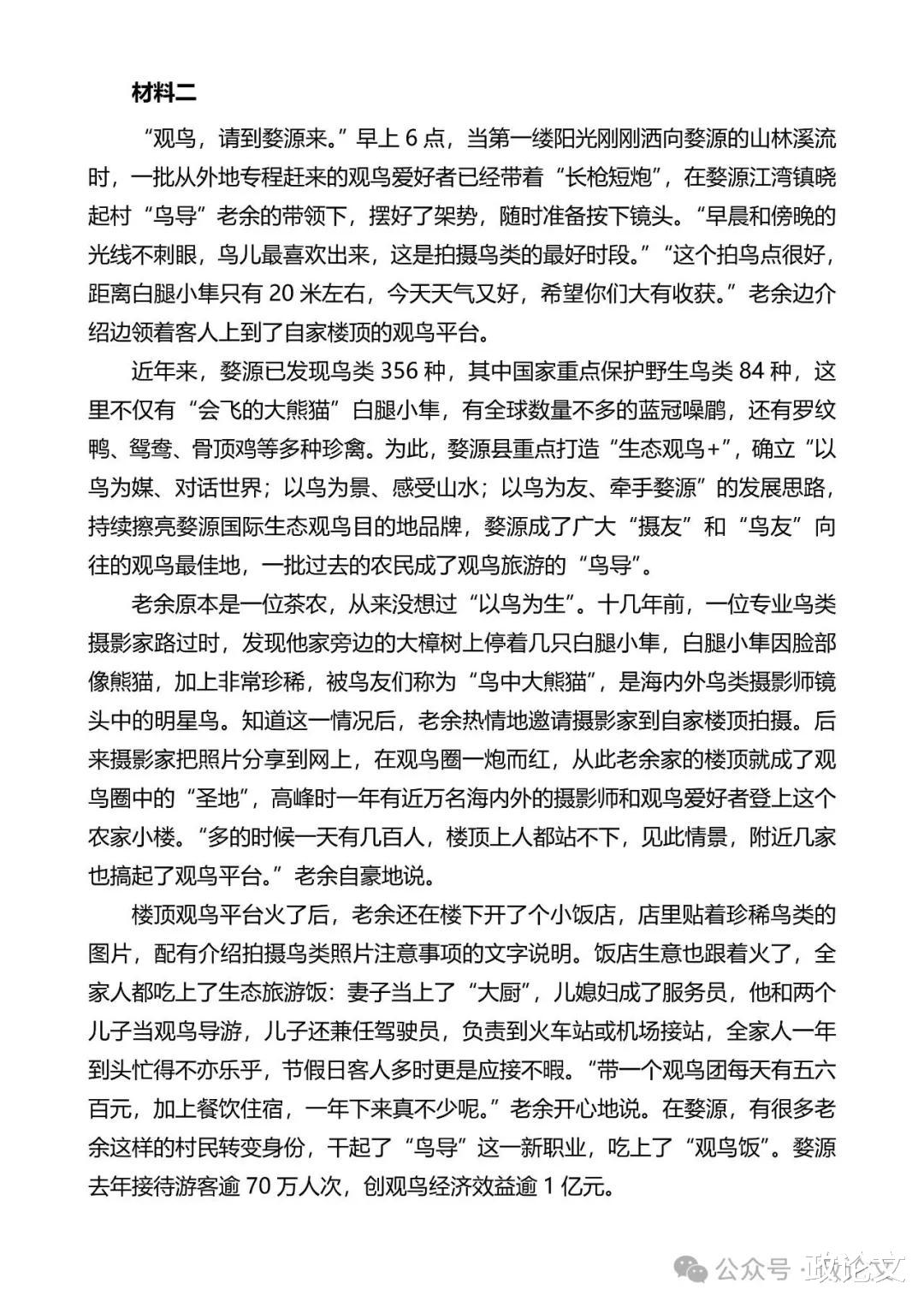 政论文评析第二段:按照“领域+新职业+具体作用”的内容要求,这一段的采分点为:生态观鸟+、擦亮婺源国际生态观鸟目的地品牌。
