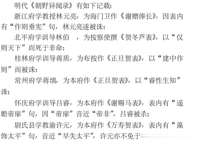 明朝最著名的文字狱被称为“表笺之祸”。朱元璋毕竟在皇宫呆着,对民间的言论了解不算多,所以朱元璋的文字狱大多是通过表笺来发动。所谓表笺就是地方的官员对朝廷写的祝贺语,基本都是一些拍马屁的文字。但朱元璋通过这些表笺发动了二十多起文字狱,这些文字狱基本都是牵强附会、望文生义而产生的,而波及之人基本被杀。