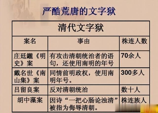 二,清朝文字狱清朝的文字狱,是从顺治年间到乾隆年间,实行了150年左右。其中,雍正和乾隆时期是文字狱的顶峰时期,雍正时期的文字狱有20起,乾隆时期有130起。乾隆末年,文字狱停止。