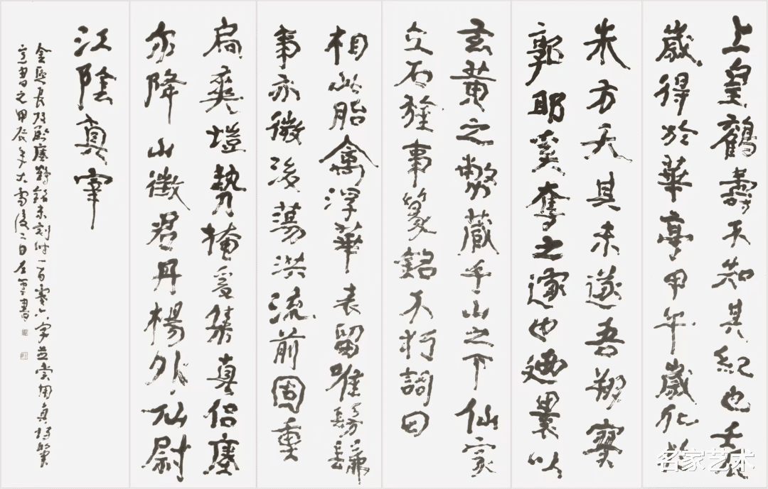 在意识的多维领域,我将自己的宇宙观融入实践。我们所在的小千世界有十七维,五维以上意识便可直接影响物质。当书者进入“心手两忘”的深度创作状态——如我在《道德经系列》创作中连续七小时不知疲倦;在创作左书《瘗鹤铭尺八屏十条屏》时的垂下眼帘,到基本上闭目创作自撰联《一室半瓯联》的状态——实已触及高维意识对三维世界的直接投射。此时,笔墨是桥梁,也是证物。