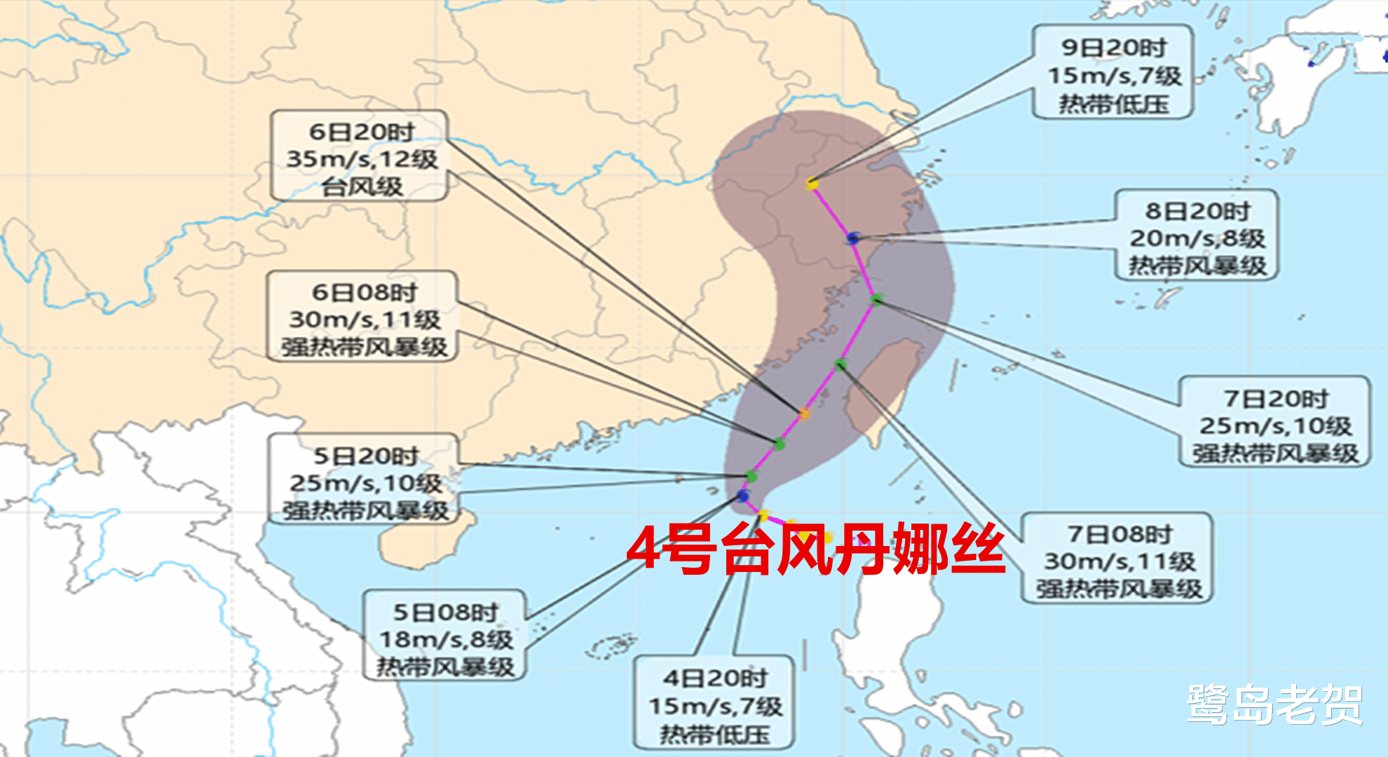 4号台风丹娜丝中心路径将穿过台湾海峡于8日下午从福建北部或浙江南部沿海地区登陆,登陆风力预计在10级左右,受台风环流云系影响,广东北部,福建,浙江,台湾岛,沿海地区将有大到暴雨,局地大暴雨降水量200毫米。