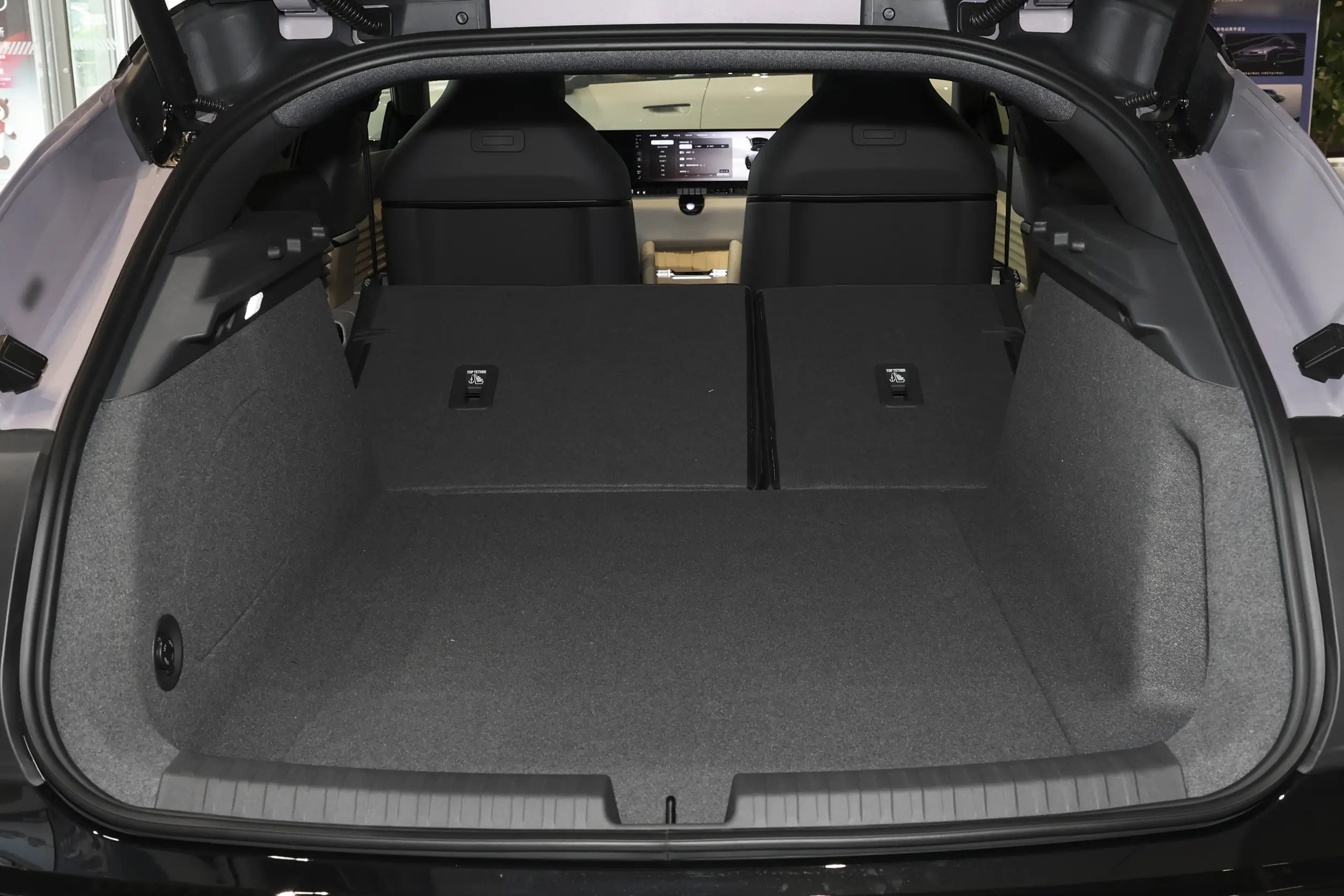 车身侧面的线条很流畅,无框车门搭配隐藏式门把手,不仅看着好看,还能降低风阻,这款车的风阻系数低至0.252Cd,对续航也能起到一定的辅助作用。标配的20英寸多辐条铝合金轮毂,搭配前245/45 R19、后285/40 R19的前后规格不同的轮胎,视觉上很有冲击力,宽一些的后胎看着就比较稳重,实际行驶中也能提升抓地力。溜背造型从车顶一直延伸到车尾,线条过渡自然,没有生硬的感觉,既保留了轿跑的运动气息,也兼顾了一定的实用属性。