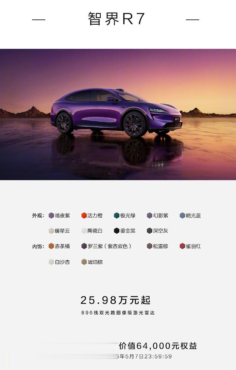智界R7、S7也同步推出了新配色,智界R7售价25.98万元起,智界新S7售价23.98万元起。