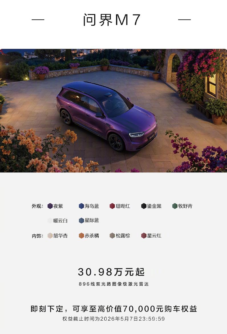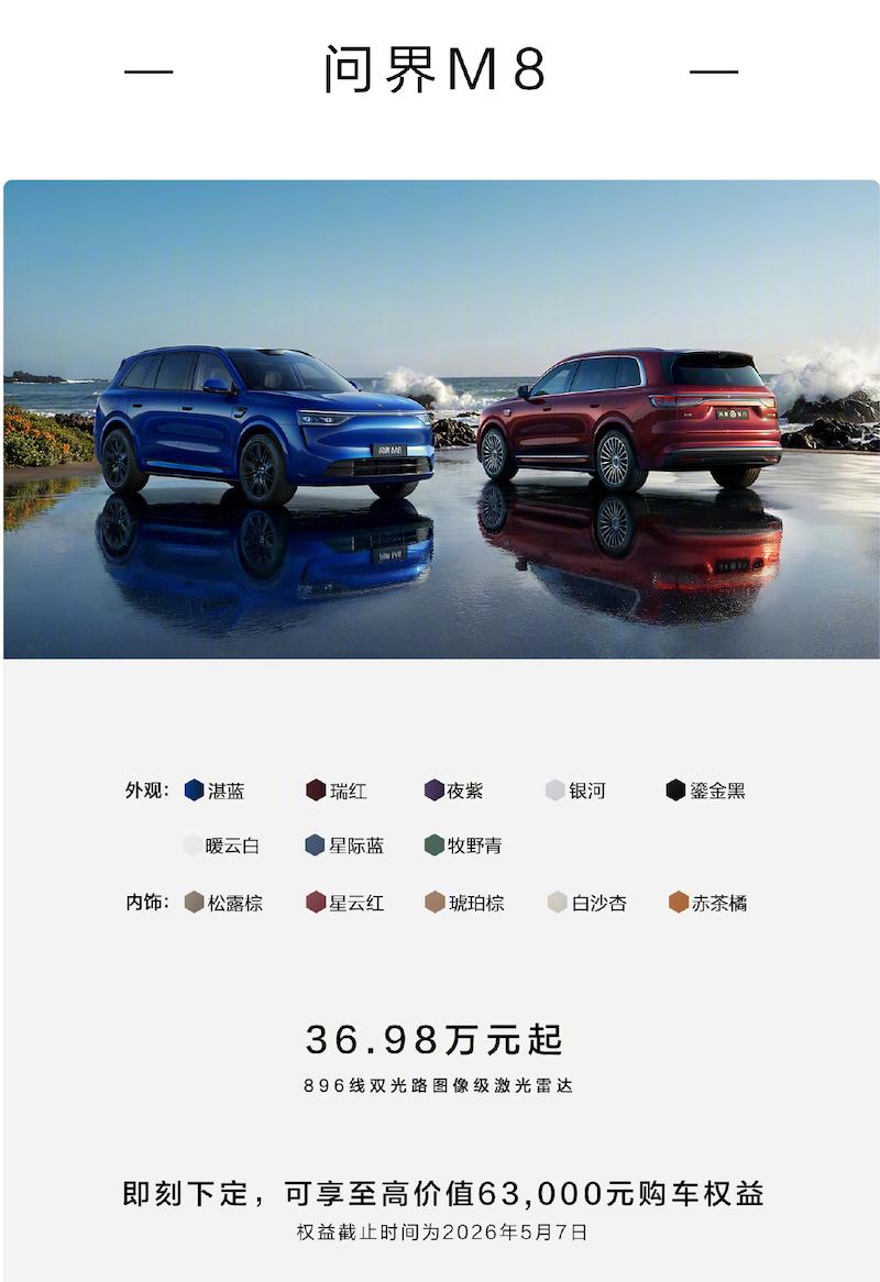 此外,问界M7、M8推出了全新的配色。焕新后的问界M7售价30.98万元起,问界M8售价36.98万元起;
