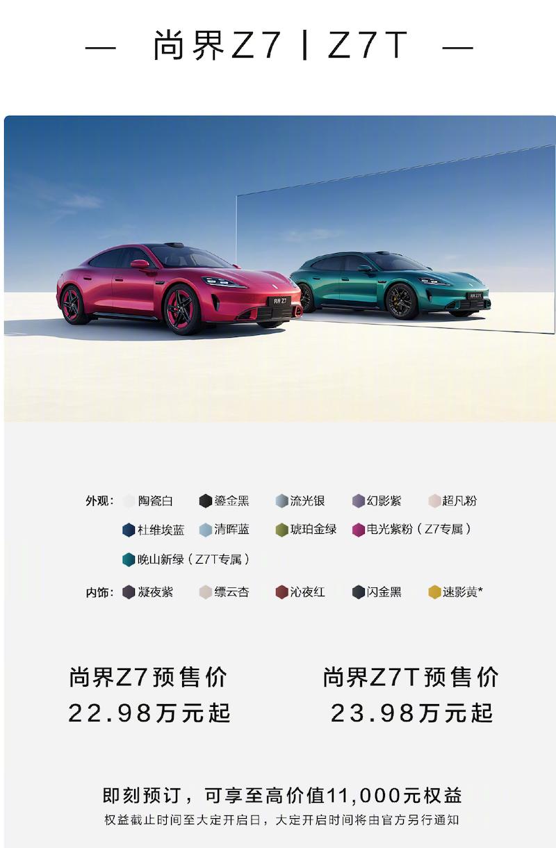 其中,尚界Z7、Z7T开启小订,尚界Z7预售价22.98万元起,尚界Z7T预售价23.98万元起;