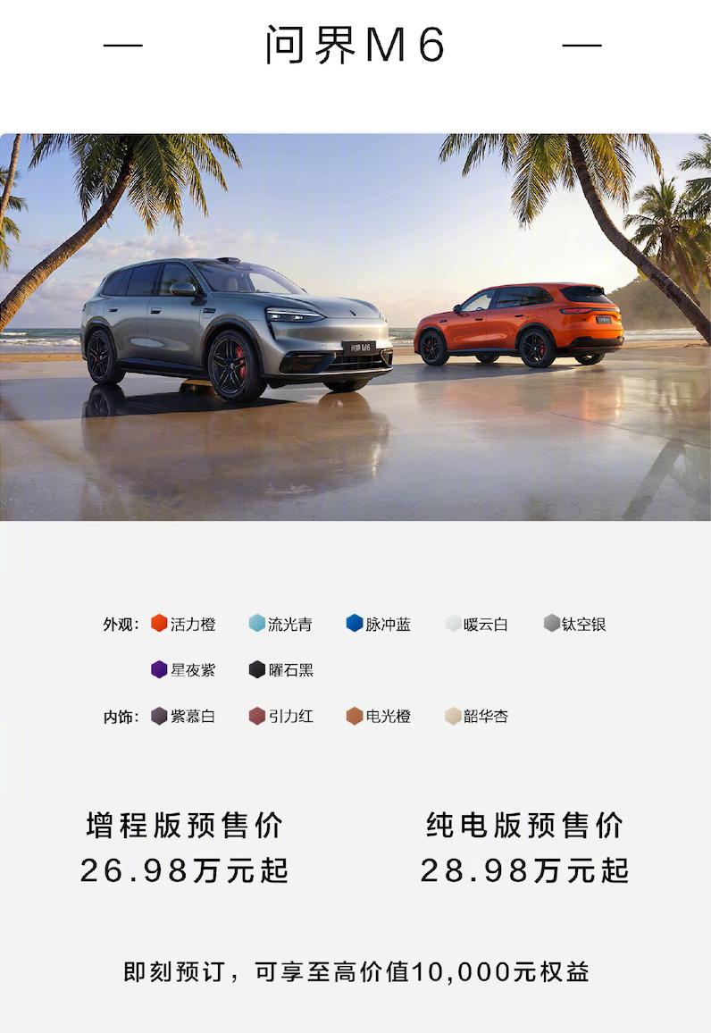 问界M6作为核心新品,定位中型SUV,提供增程、纯电双动力选择,增程版预售价26.98万元起,纯电版预售价28.98万元起。