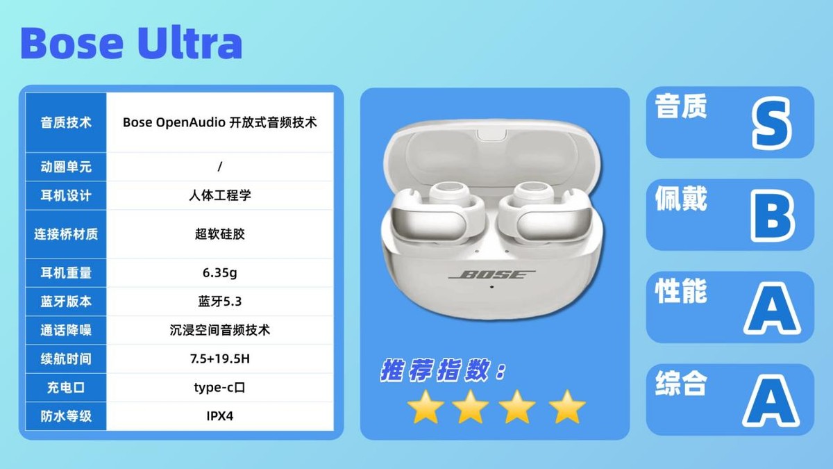 Bose Ultra:这款耳机是Bose推出的高端开放式耳机系列,延续了品牌在声学技术上的强大实力。Bose一直以精准的声音调校和舒适的佩戴体验著称,这款耳机同样表现出色。无论是空间感、音质细节还是声音层次,都让人听起来饱满自然。无论是在通勤途中还是办公室里使用,Bose Ultra都能带来沉浸式的听感体验。